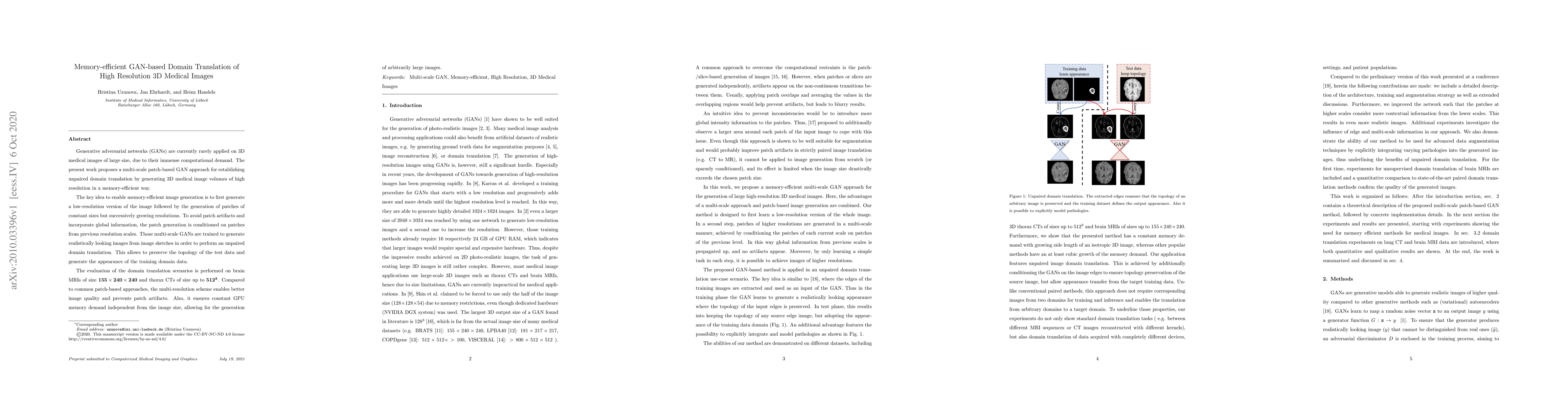 This paper proposes a memory-efficient GAN-based approach for unpaired domain translation of high-resolution 3D medical images by generating multi-scale patches. The method generates low-resolution images first, followed by progressively higher-resolution patches, conditioned on previous scales to avoid artifacts and incorporate global information.