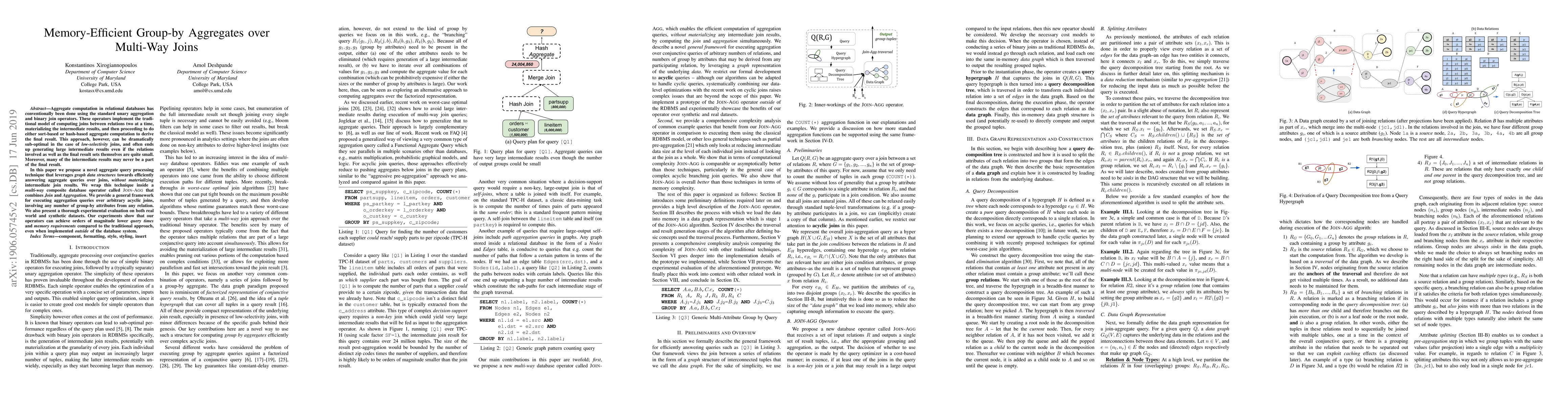 This paper proposes a novel memory-efficient technique for group-by aggregates over multi-way joins using graph data structures and a new JOIN-AGG operator, achieving significantly lower query times and memory usage compared to traditional methods. Experimental results demonstrate substantial improvements on both real-world and synthetic datasets.