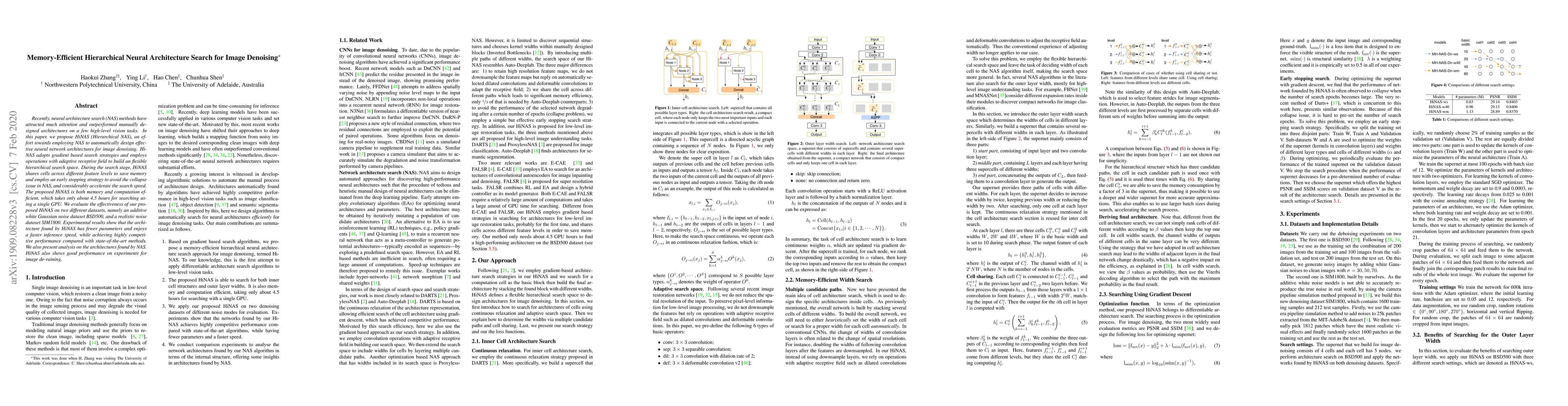 This paper introduces HiNAS, a memory-efficient hierarchical neural architecture search method for image denoising, which employs gradient-based strategies and adaptive receptive fields. The proposed method accelerates the search process and achieves competitive denoising performance with fewer parameters and faster inference speeds.