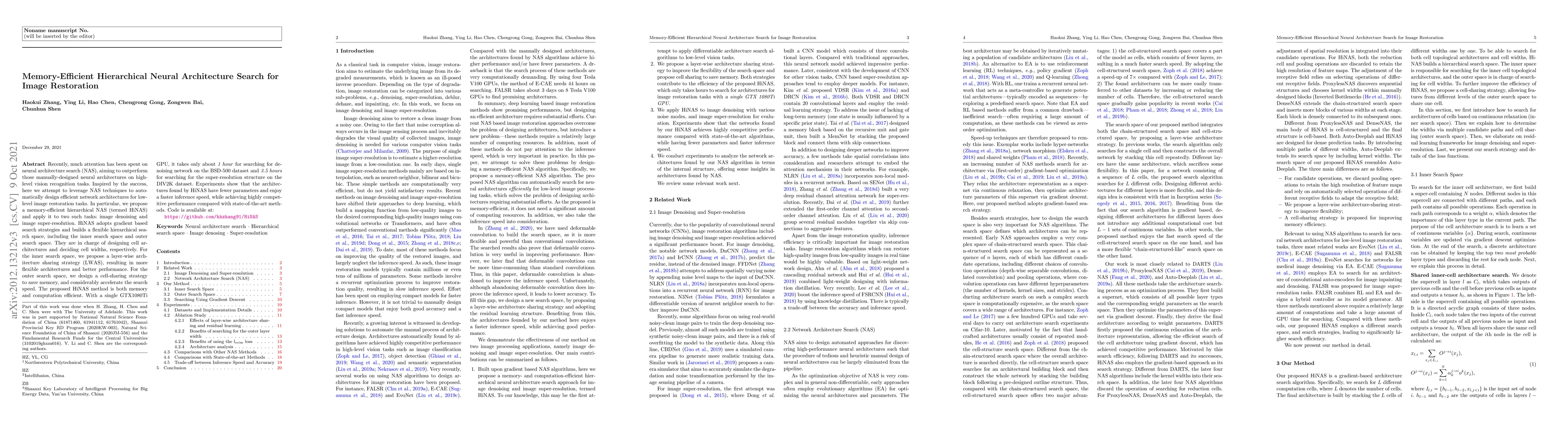 This paper proposes a memory-efficient hierarchical neural architecture search (HiNAS) method for image restoration tasks, achieving competitive performance with fewer parameters and faster inference speeds. HiNAS employs gradient-based search strategies and a flexible hierarchical search space to design efficient network architectures for image denoising and super-resolution.