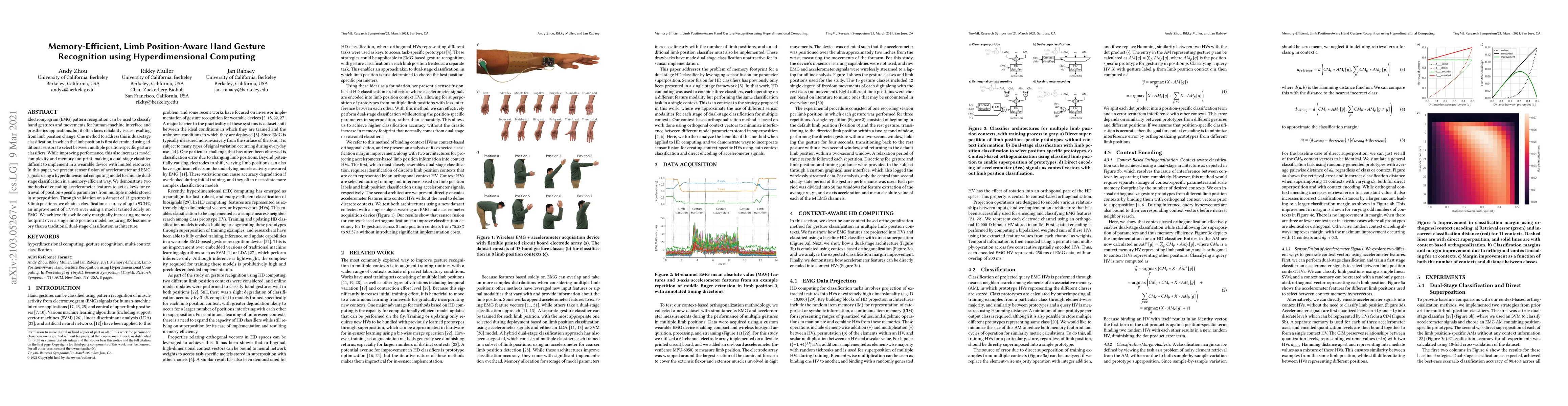 This paper proposes a memory-efficient method for hand gesture recognition using hyperdimensional computing, combining EMG and accelerometer data to adapt to limb position changes. The approach achieves up to 93.34% classification accuracy, significantly outperforming EMG-only models while requiring significantly less memory than traditional dual-stage classifiers.
