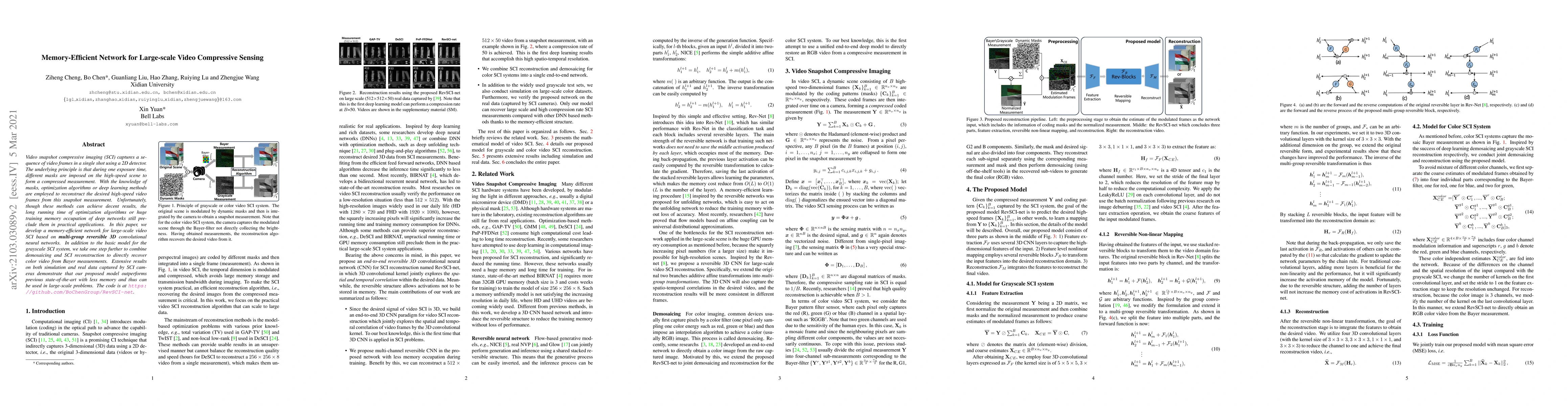 This paper proposes a memory-efficient network using multi-group reversible 3D convolutional neural networks for large-scale video compressive sensing, achieving faster reconstruction and lower memory usage compared to previous methods. The model also integrates demosaicing for direct color video recovery from Bayer measurements, outperforming state-of-the-art results on both simulated and real data.