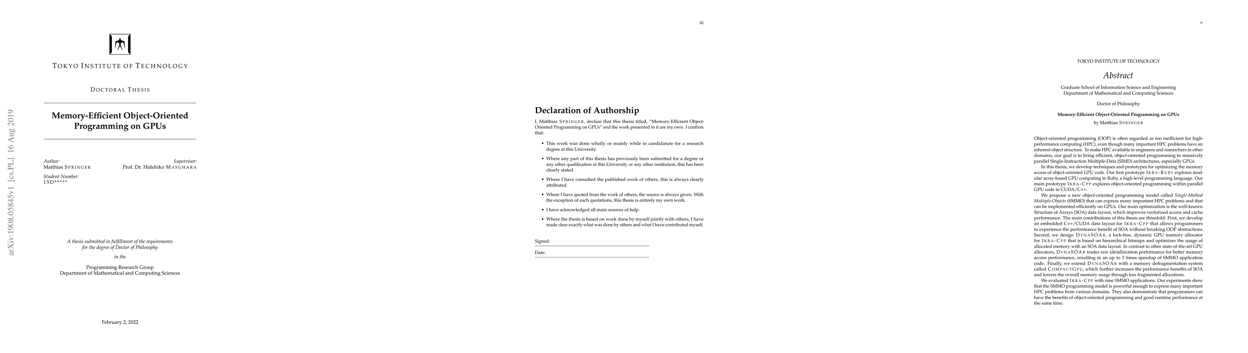 This paper presents techniques for optimizing object-oriented programming on GPUs, focusing on the Single-Method Multiple-Objects (SMMO) model. It introduces an embedded C++ SOA layout DSL and a lock-free dynamic memory allocator, followed by memory defragmentation methods to enhance memory efficiency.