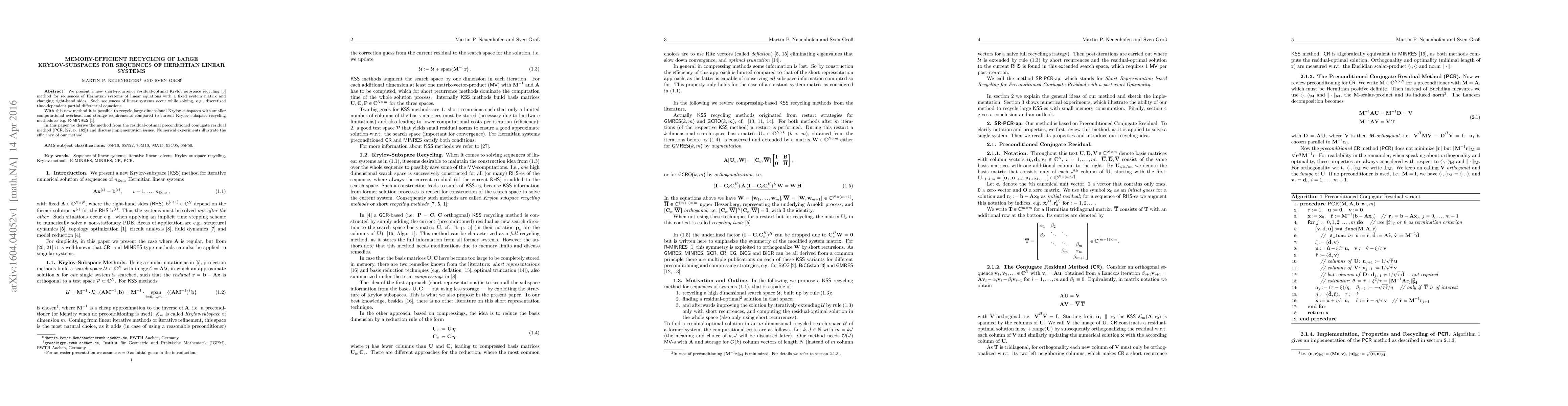 We present a new short-recurrence reaidual-optimal Krylov subspace recycling method for sequences of Hermitian systems of linear equations with a fixed system matrix and changing right-hand sides. Such sequences of linear systems occur while solving, e.g., discretized time-dependent partial differential equations. With this new method it is possible to recycle large-dimensional Krylov-subspaces with smaller computational overhead and storage requirements compared to current Krylov subspace recycling methods as e.g. R-MINRES. In this paper we derive the method from the residual-optimal preconditioned conjugate residual method and duscuss implementation issues. Numerical experiments illustrate the efficiency of our method.