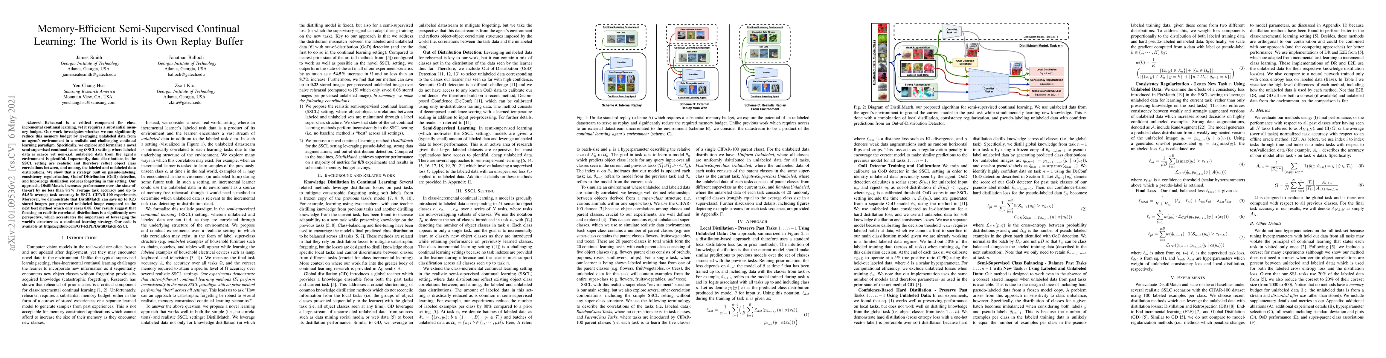 Rehearsal is a critical component for class-incremental continual learning, yet it requires a substantial memory budget. Our work investigates whether we can significantly reduce this memory budget by leveraging unlabeled data from an agent's environment in a realistic and challenging continual learning paradigm. Specifically, we explore and formalize a novel semi-supervised continual learning (SSCL) setting, where labeled data is scarce yet non-i.i.d. unlabeled data from the agent's environment is plentiful. Importantly, data distributions in the SSCL setting are realistic and therefore reflect object class correlations between, and among, the labeled and unlabeled data distributions. We show that a strategy built on pseudo-labeling, consistency regularization, Out-of-Distribution (OoD) detection, and knowledge distillation reduces forgetting in this setting. Our approach, DistillMatch, increases performance over the state-of-the-art by no less than 8.7% average task accuracy and up to 54.5% average task accuracy in SSCL CIFAR-100 experiments. Moreover, we demonstrate that DistillMatch can save up to 0.23 stored images per processed unlabeled image compared to the next best method which only saves 0.08. Our results suggest that focusing on realistic correlated distributions is a significantly new perspective, which accentuates the importance of leveraging the world's structure as a continual learning strategy.