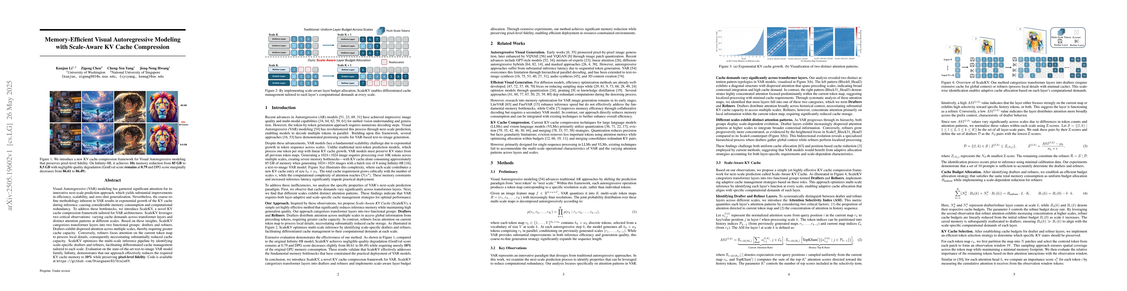 A new cache compression framework called ScaleKV reduces memory consumption in Visual Autoregressive (VAR) modeling to 10% while preserving pixel-level fidelity.