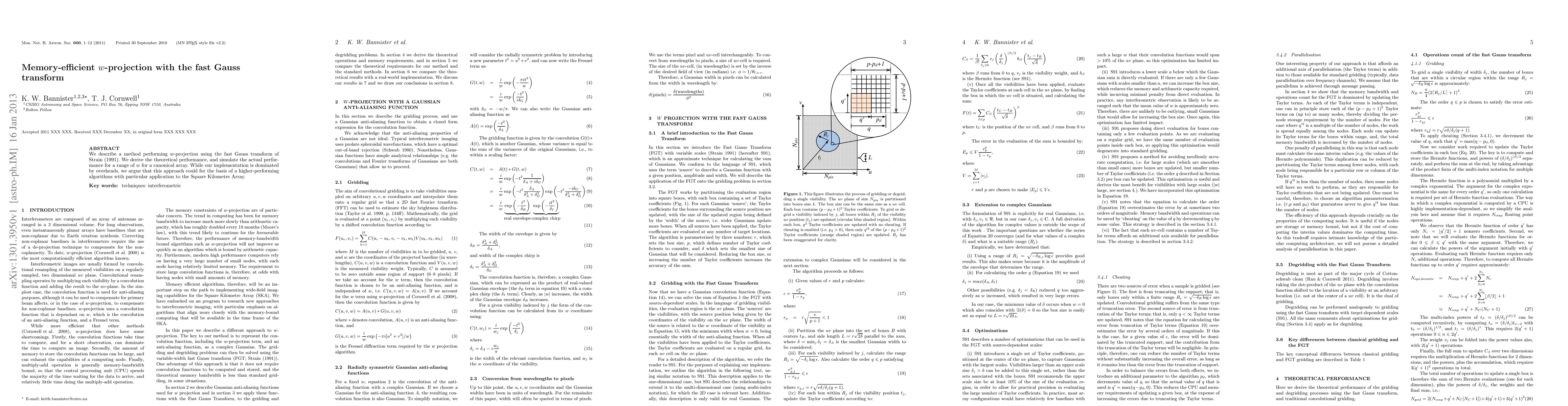 This paper presents a memory-efficient w-projection method using the fast Gauss transform, demonstrating theoretical and simulated performance across various w values for a canonical array. Despite current overheads, the authors suggest this approach could underpin more efficient algorithms, especially for the Square Kilometer Array.