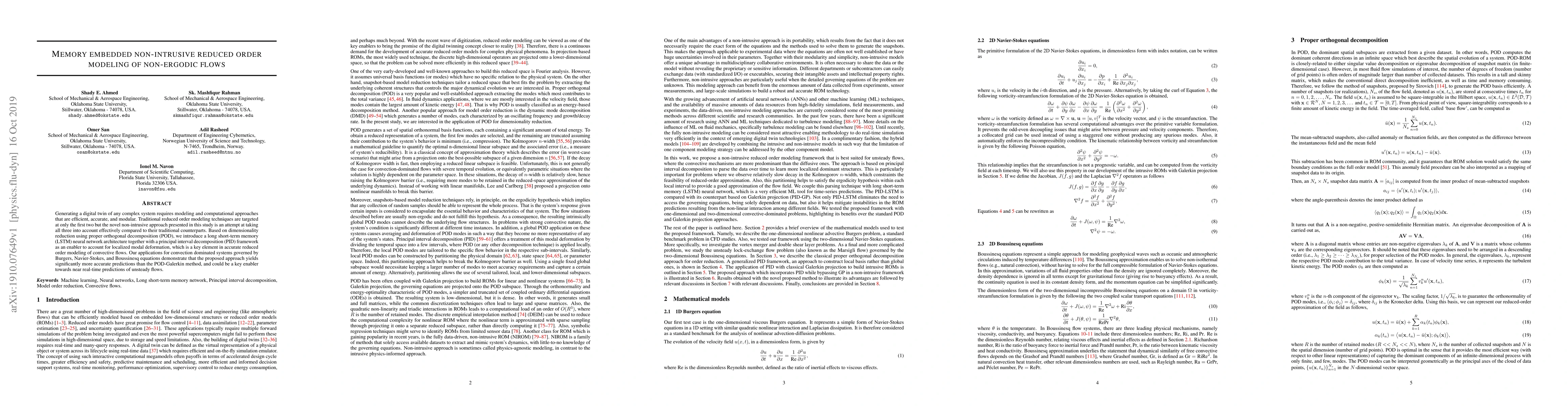 This paper proposes a memory embedded non-intrusive reduced order modeling technique combining LSTM neural networks and principal interval decomposition for accurate, efficient, and modular modeling of non-ergodic flows. The approach outperforms traditional POD-Galerkin methods in predicting convective flows governed by Burgers, Navier-Stokes, and Boussinesq equations.