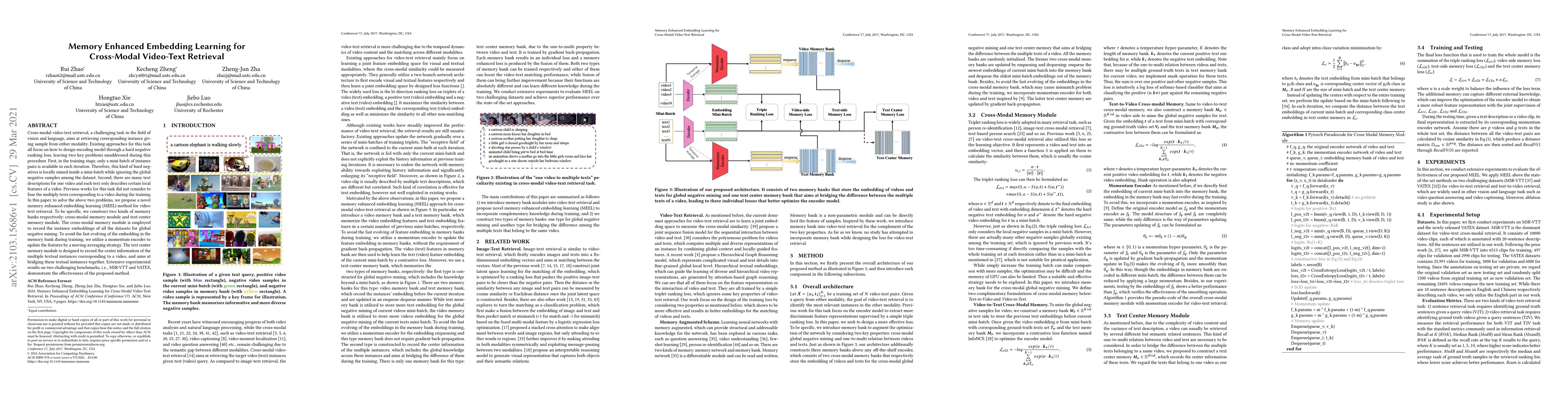 This paper proposes a Memory Enhanced Embedding Learning (MEEL) method to address two key issues in cross-modal video-text retrieval: global negative mining and fusion of multiple text descriptions for a single video. The method employs memory banks to record global negatives and text centers, enhancing the embedding learning process. Experimental results on MSR-VTT and VATEX benchmarks show the effectiveness of the proposed approach.