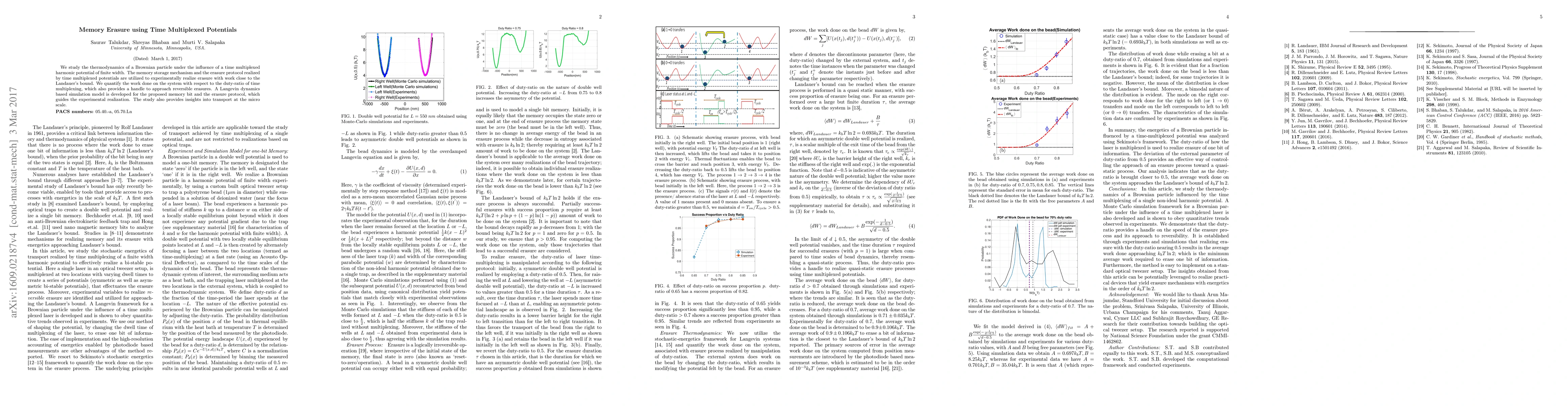 This paper investigates the thermodynamics of a Brownian particle under a time multiplexed harmonic potential, demonstrating the realization of memory erasure close to Landauer's limit. The study quantifies the work done based on the duty-ratio of time multiplexing, offering insights into reversible erasures and micro-scale transport.