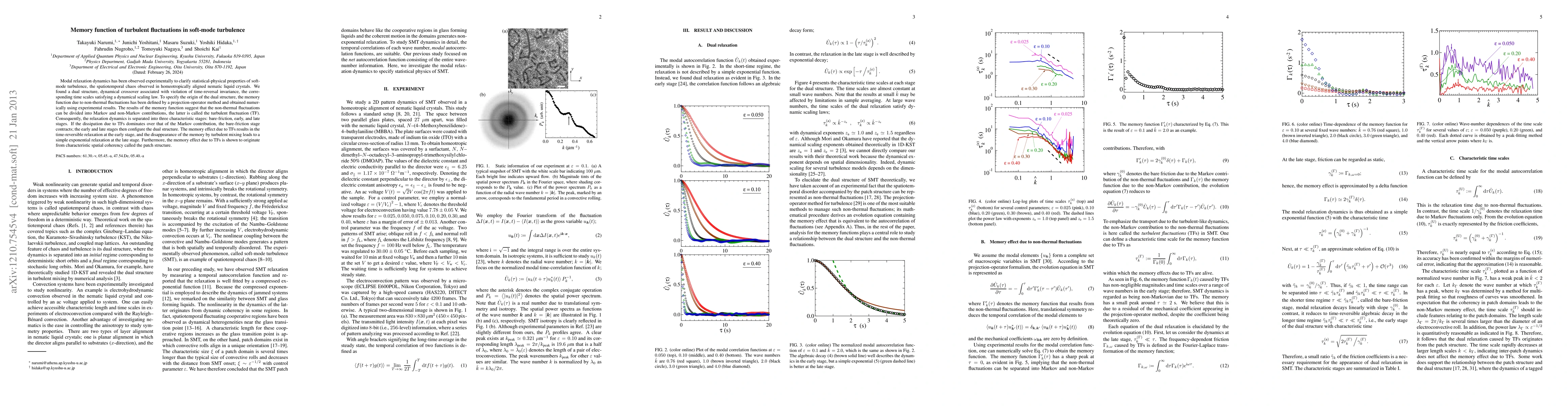 Modal relaxation dynamics has been observed experimentally to clarify statistical-physical properties of soft-mode turbulence, the spatiotemporal chaos observed in homeotropically aligned nematic liquid crystals. We found a dual structure, dynamical crossover associated with violation of time-reversal invariance, the corresponding time scales satisfying a dynamical scaling law. To specify the origin of the dual structure, the memory function due to non-thermal fluctuations has been defined by a projection-operator method and obtained numerically using experimental results. The results of the memory function suggest that the non-thermal fluctuations can be divided into Markov and non-Markov contributions, the latter is called the turbulent fluctuation (TF). Consequently, the relaxation dynamics is separated into three characteristic stages: bare-friction, early, and late stages. If the dissipation due to TFs dominates over that of the Markov contribution, the bare-friction stage contracts; the early and late stages then configure the dual structure. The memory effect due to TFs results in the time-reversible relaxation at the early stage, and the disappearance of the memory by turbulent mixing leads to a simple exponential relaxation at the late stage. Furthermore, the memory effect due to TFs is shown to originate from characteristic spatial coherency called the patch structure.