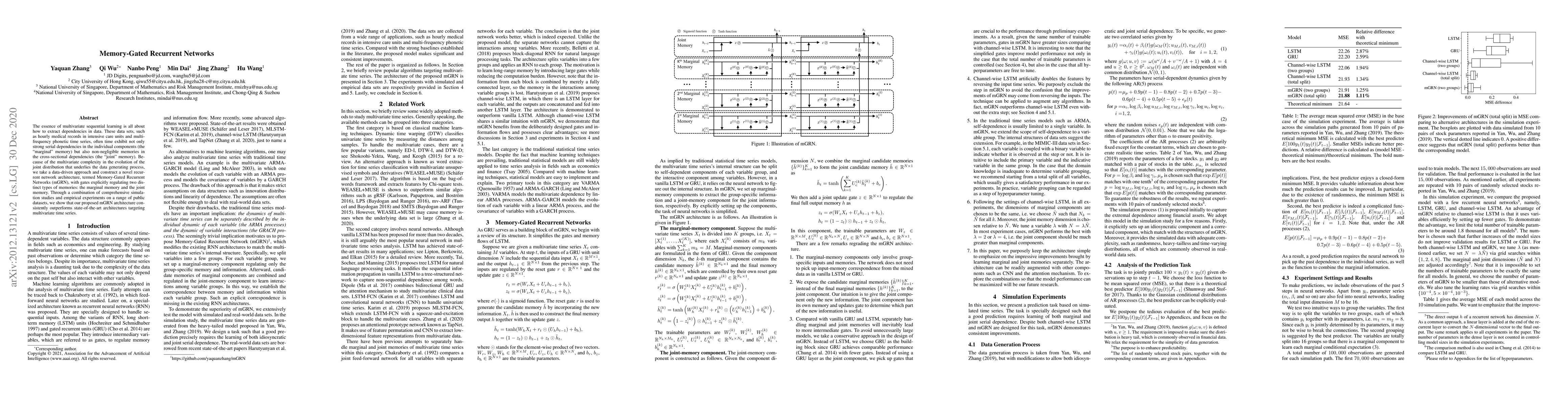The paper introduces Memory-Gated Recurrent Networks (mGRN) to handle complex multivariate sequential data by explicitly regulating two types of memory: marginal and joint. The proposed architecture outperforms existing methods in various datasets, demonstrating its effectiveness in multivariate time series analysis.