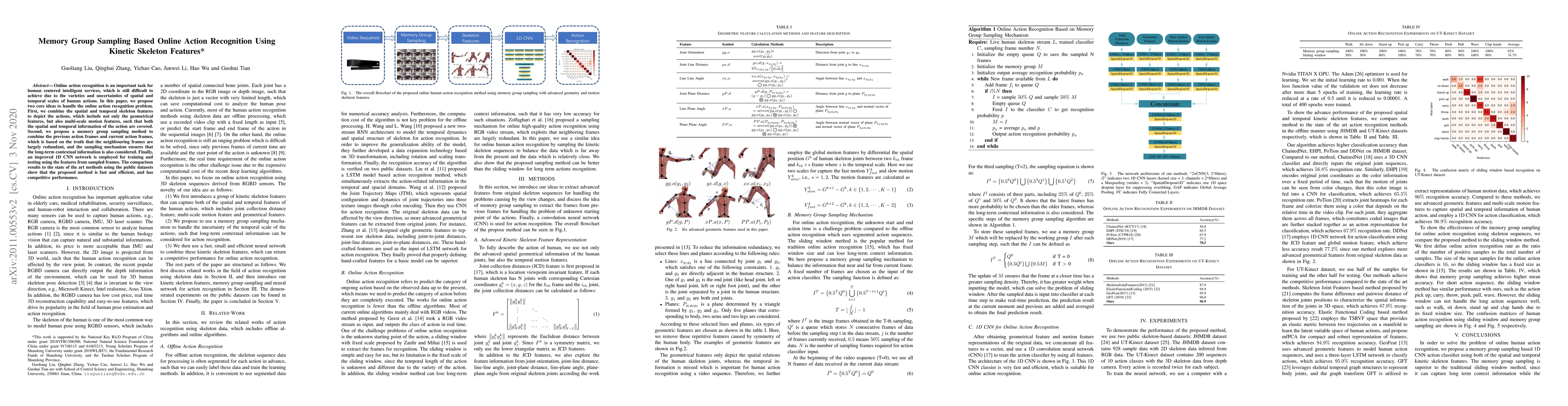 This paper proposes an online action recognition method using combined spatial and temporal skeleton features, along with a memory group sampling technique to efficiently integrate long-term contextual information. An improved 1D CNN network is used for training and testing, demonstrating fast, efficient, and competitive performance against state-of-the-art methods.