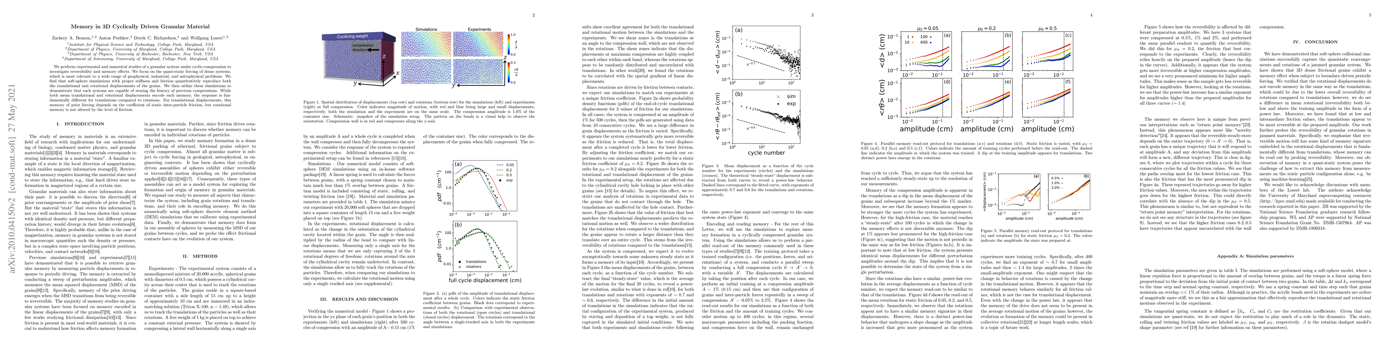 Researchers studied a type of material that stores memory of previous compressions, which can affect its behavior in different ways for translations and rotations. They found that these systems can retain information from past compressions, with implications for geophysical, industrial, and astrophysical applications.
