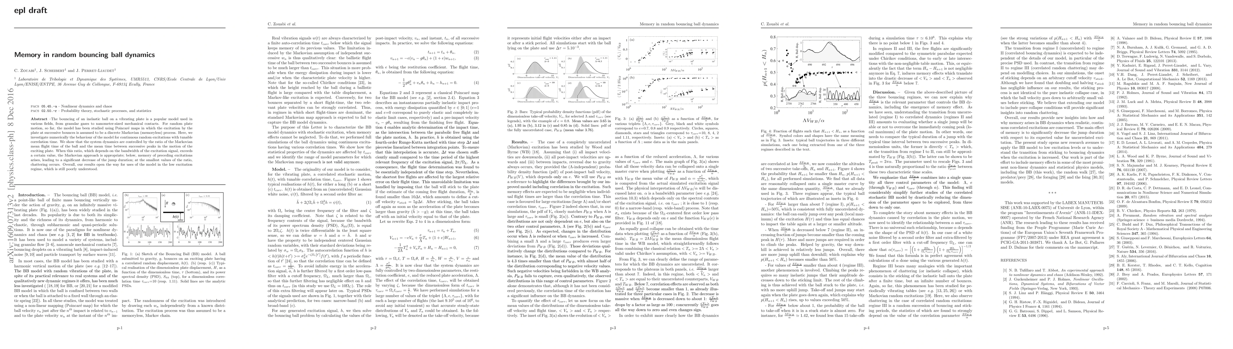 The bouncing of an inelastic ball on a vibrating plate is a popular model used in various fields, from granular gases to nanometer-sized mechanical contacts. For random plate motion, so far, the model has been studied using Poincar{\'e} maps in which the excitation by the plate at successive bounces is assumed to be a discrete Markovian (memoryless) process. Here, we investigate numerically the behaviour of the model for continuous random excitations with tunable correlation time. We show that the system dynamics are controlled by the ratio of the Markovian mean flight time of the ball and the mean time between successive peaks in the motion of the exciting plate. When this ratio, which depends on the bandwidth of the excitation signal, exceeds a certain value, the Markovian approach is appropriate; below, memory of preceding excitations arises, leading to a significant decrease of the jump duration; at the smallest values of the ratio, chattering occurs. Overall, our results open the way for uses of the model in the low excitation regime, which is still poorly understood.