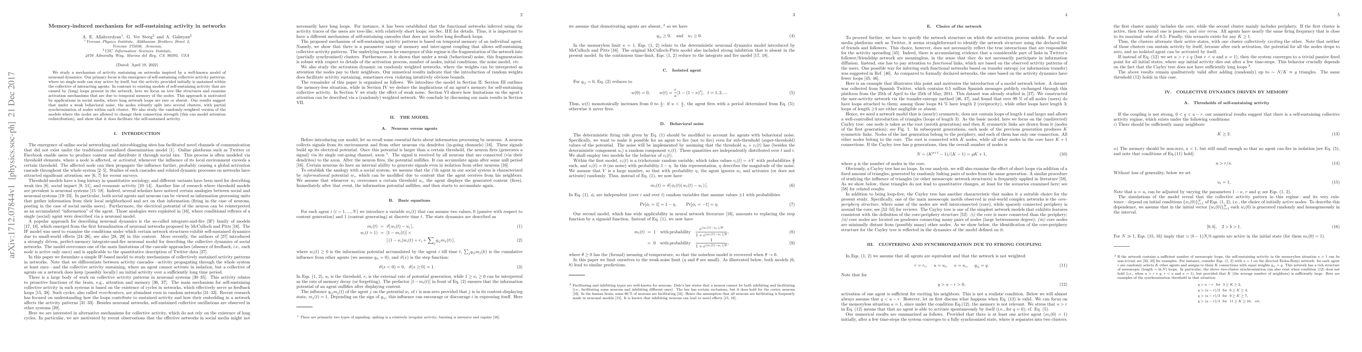 We study a mechanism of activity sustaining on networks inspired by a well-known model of neuronal dynamics. Our primary focus is the emergence of self-sustaining collective activity patterns, where no single node can stay active by itself, but the activity provided initially is sustained within the collective of interacting agents. In contrast to existing models of self-sustaining activity that are caused by (long) loops present in the network, here we focus on tree--like structures and examine activation mechanisms that are due to temporal memory of the nodes. This approach is motivated by applications in social media, where long network loops are rare or absent. Our results suggest that under a weak behavioral noise, the nodes robustly split into several clusters, with partial synchronization of nodes within each cluster. We also study the randomly-weighted version of the models where the nodes are allowed to change their connection strength (this can model attention redistribution), and show that it does facilitate the self-sustained activity.