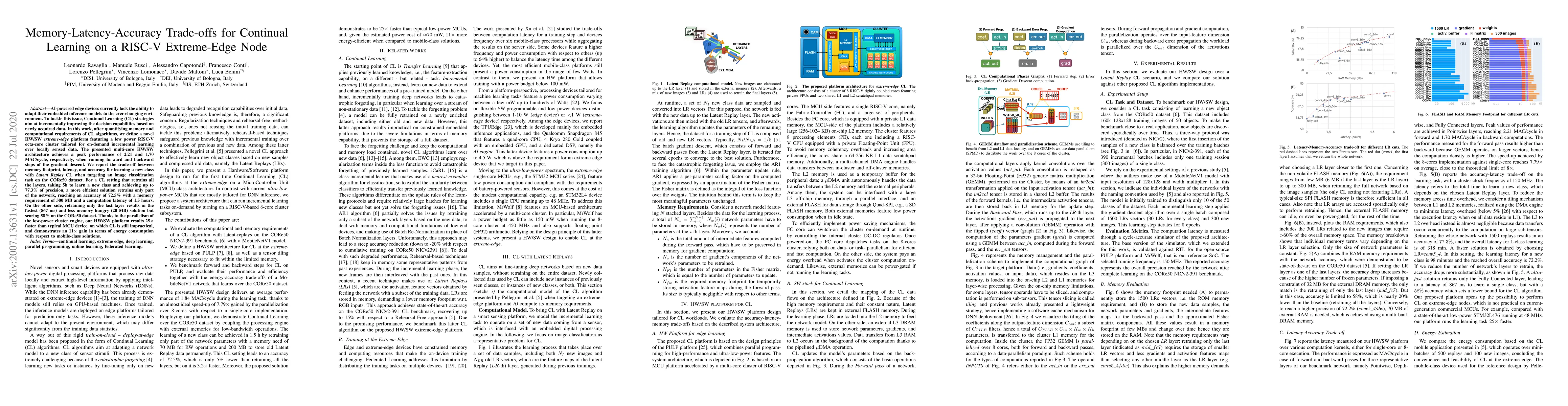 This research paper explores memory-latency trade-offs for Continual Learning on a low-power RISC-V extreme-edge node, achieving significant performance gains and energy efficiency improvements over typical MCU devices.