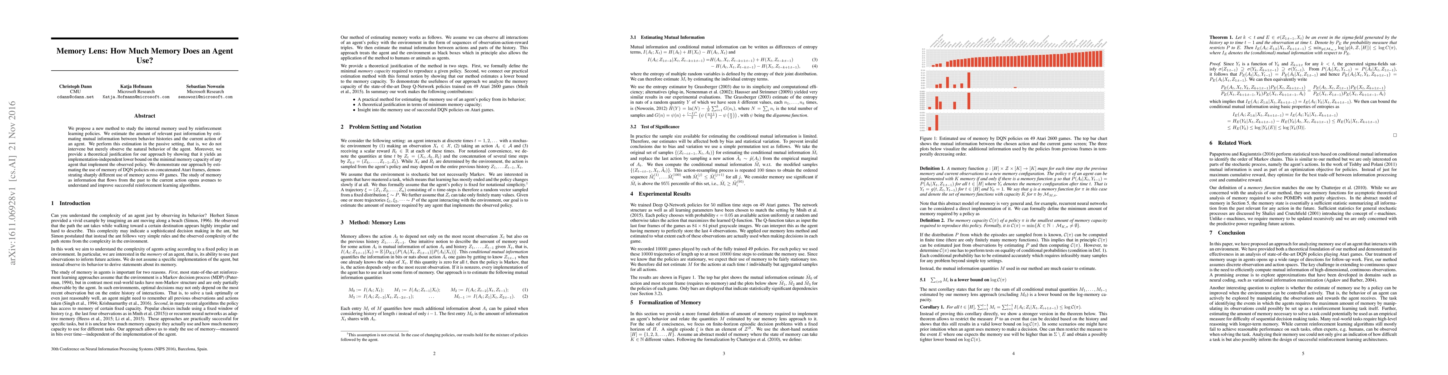 We propose a new method to study the internal memory used by reinforcement learning policies. We estimate the amount of relevant past information by estimating mutual information between behavior histories and the current action of an agent. We perform this estimation in the passive setting, that is, we do not intervene but merely observe the natural behavior of the agent. Moreover, we provide a theoretical justification for our approach by showing that it yields an implementation-independent lower bound on the minimal memory capacity of any agent that implement the observed policy. We demonstrate our approach by estimating the use of memory of DQN policies on concatenated Atari frames, demonstrating sharply different use of memory across 49 games. The study of memory as information that flows from the past to the current action opens avenues to understand and improve successful reinforcement learning algorithms.