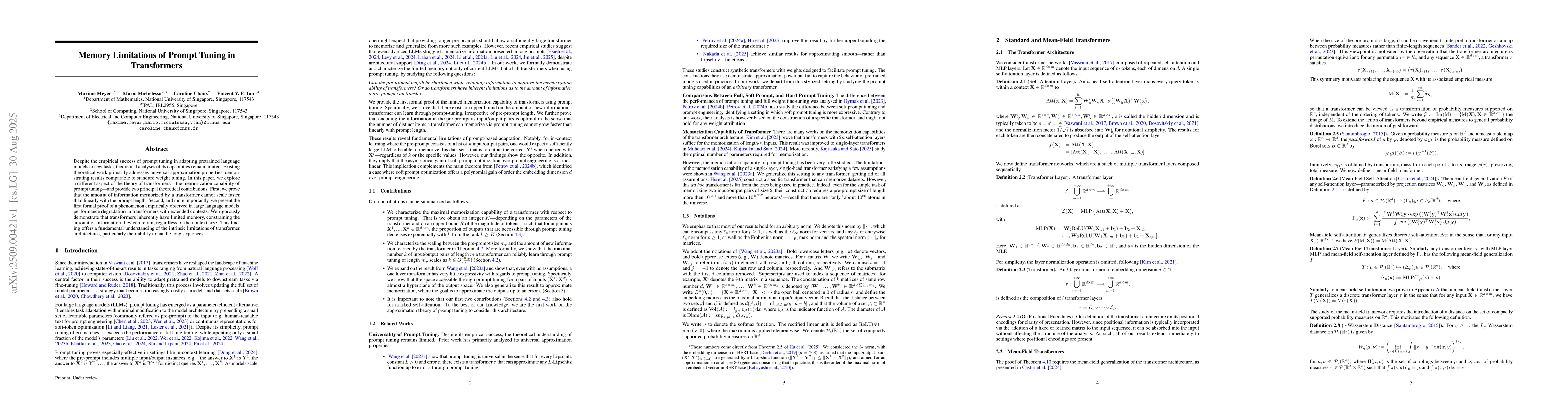 Despite the empirical success of prompt tuning in adapting pretrained language models to new tasks, theoretical analyses of its capabilities remain limited. Existing theoretical work primarily addresses universal approximation properties, demonstrating results comparable to standard weight tuning. In this paper, we explore a different aspect of the theory of transformers: the memorization capability of prompt tuning. We provide two principal theoretical contributions. First, we prove that the amount of information memorized by a transformer cannot scale faster than linearly with the prompt length. Second, and more importantly, we present the first formal proof of a phenomenon empirically observed in large language models: performance degradation in transformers with extended contexts. We rigorously demonstrate that transformers inherently have limited memory, constraining the amount of information they can retain, regardless of the context size. This finding offers a fundamental understanding of the intrinsic limitations of transformer architectures, particularly their ability to handle long sequences.