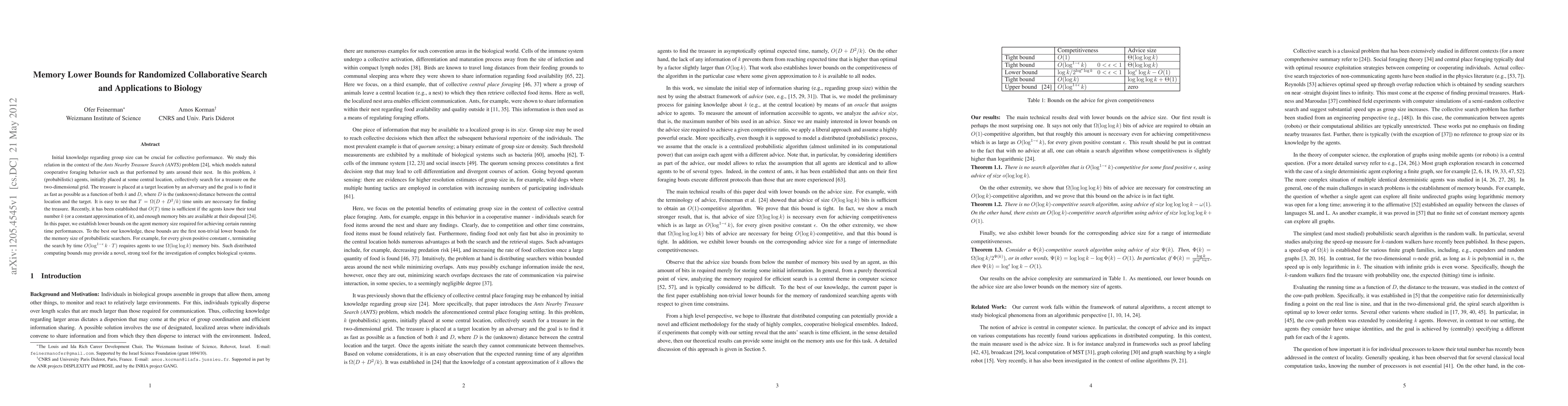Initial knowledge regarding group size can be crucial for collective performance. We study this relation in the context of the {\em Ants Nearby Treasure Search (ANTS)} problem \cite{FKLS}, which models natural cooperative foraging behavior such as that performed by ants around their nest. In this problem, $k$ (probabilistic) agents, initially placed at some central location, collectively search for a treasure on the two-dimensional grid. The treasure is placed at a target location by an adversary and the goal is to find it as fast as possible as a function of both $k$ and $D$, where $D$ is the (unknown) distance between the central location and the target. It is easy to see that $T=\Omega(D+D^2/k)$ time units are necessary for finding the treasure. Recently, it has been established that $O(T)$ time is sufficient if the agents know their total number $k$ (or a constant approximation of it), and enough memory bits are available at their disposal \cite{FKLS}. In this paper, we establish lower bounds on the agent memory size required for achieving certain running time performances. To the best our knowledge, these bounds are the first non-trivial lower bounds for the memory size of probabilistic searchers. For example, for every given positive constant $\epsilon$, terminating the search by time $O(\log^{1-\epsilon} k \cdot T)$ requires agents to use $\Omega(\log\log k)$ memory bits. Such distributed computing bounds may provide a novel, strong tool for the investigation of complex biological systems.