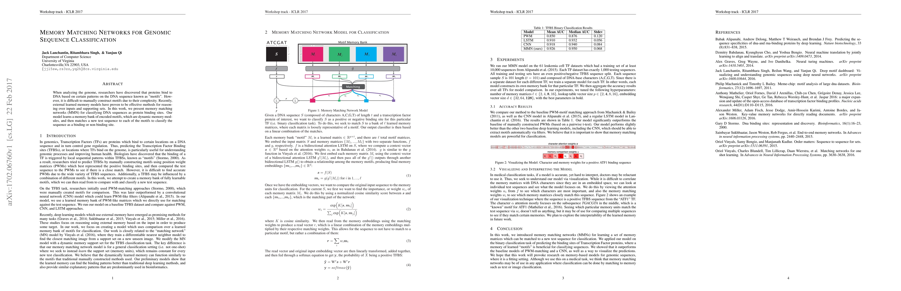 Memory matching networks (MMN) are introduced to classify DNA sequences as protein binding sites by learning a dynamic memory bank of encoded motifs and matching new sequences to these motifs. This approach automates the complex task of motif identification in genomic sequences.
