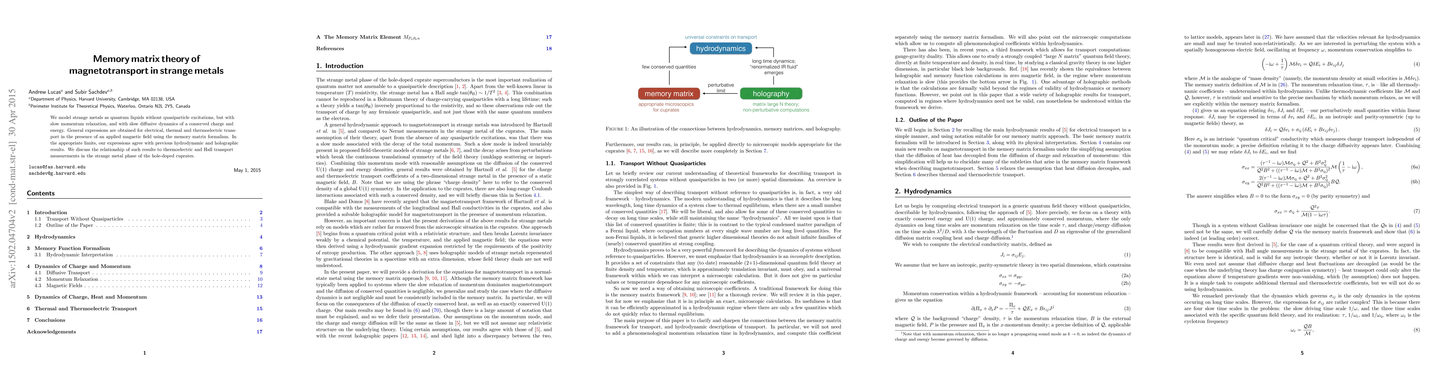 This paper models strange metals using memory matrix theory, describing them as quantum liquids without quasiparticle excitations but with slow relaxation and diffusive dynamics. It provides general expressions for transport phenomena under magnetic fields, aligning with previous hydrodynamic and holographic findings, and relates these to thermoelectric and Hall transport in cuprate strange metal phases.