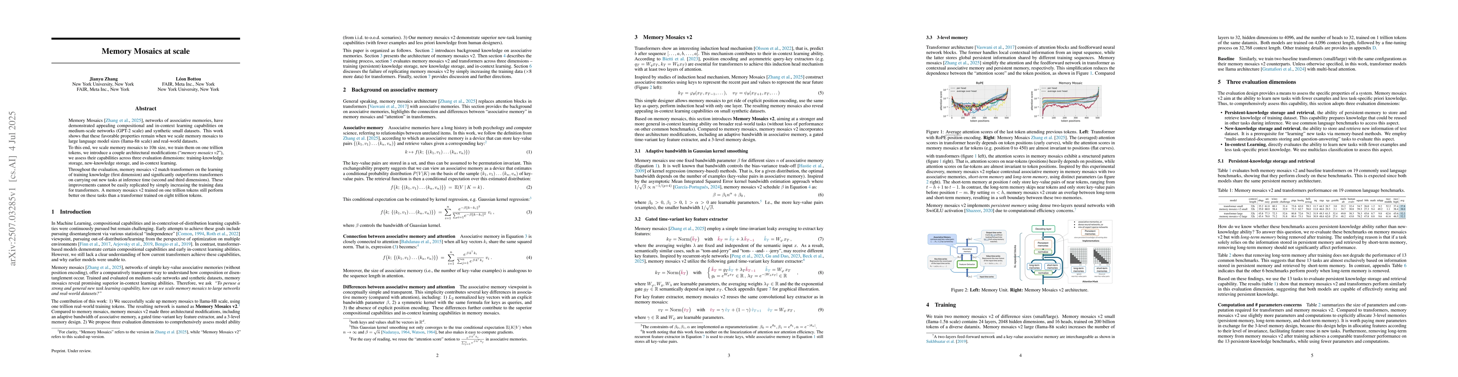 Memory Mosaics, networks of associative memories, have been scaled to 10B size and trained on one trillion tokens. They match Transformers in training knowledge acquisition but significantly outperform them in new task inference and knowledge retention, even when compared to Transformers trained on eight trillion tokens.