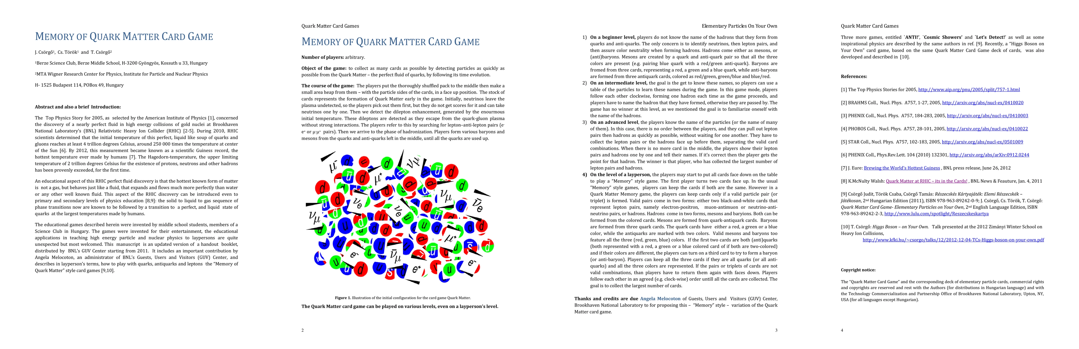 Scientists at the Relativistic Heavy Ion Collider (RHIC, BNL) recently discovered, that the hottest known form of matter is not a gas, but acts like a fluid. Furthermore, this fluid of quarks expands and flows much more perfectly than water or any other well known fluid. This aspect of the RHIC discovery can be introduced even to primary levels of physics education, noting that the usual solid to liquid to gas sequence of phase transitions now are known to be followed by a transition to a nearly perfect fluid, a liquid of quarks, at the largest temperatures made by humans. The educational games described herein were invented by middle school students, members of a Science Club in Hungary. The games were invented for their entertainment, the educational applications in teaching high energy particle and nuclear physics to laypersons are quite unexpected but most welcomed. This manuscript describes games with a deck of cards called Quark Matter cards, where each card represents an elementary particle. The games include an important contribution by Angela Melocoton, an administrator of the Guests, Users and Visitors (GUV) Center at BNL. It describes in simple terms, how to play the Memory of Quark Matter style card games.