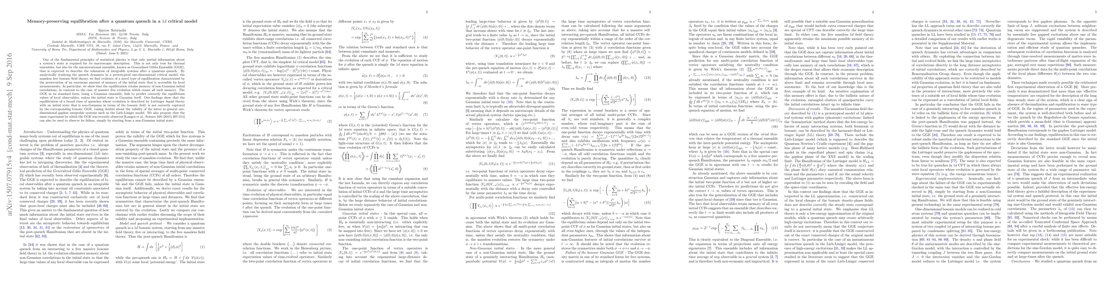 This paper investigates memory preservation in equilibration dynamics following a quantum quench in a 1D critical model, revealing that the equilibration retains significant non-Gaussian initial state memory. The Generalized Gibbs Ensemble (GGE) fails to accurately predict the equilibration process for non-Gaussian initial states, challenging the GGE's applicability in one-dimensional gapless integrable systems.
