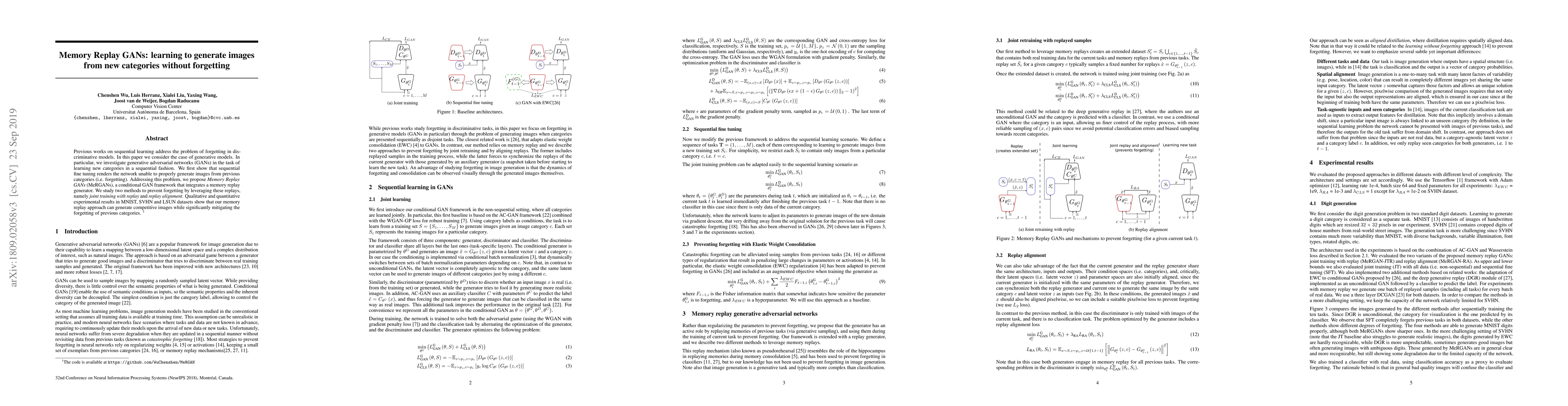 Memory Replay GANs (MeRGANs) address the issue of forgetting in generative adversarial networks (GANs) when sequentially learning new image categories. The proposed method integrates a memory replay generator to prevent forgetting, achieving competitive image generation while maintaining performance on previous categories.