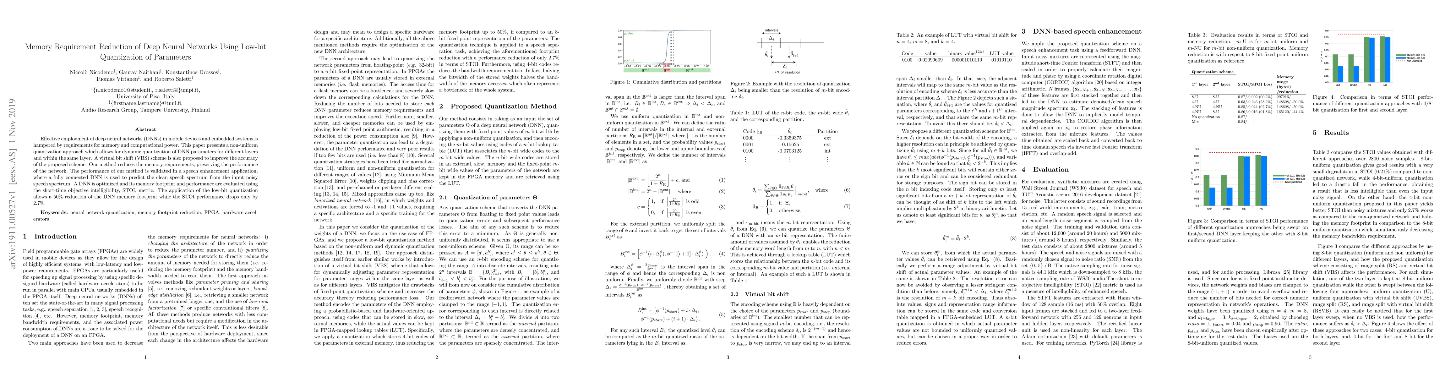 Effective employment of deep neural networks (DNNs) in mobile devices and embedded systems is hampered by requirements for memory and computational power. This paper presents a non-uniform quantization approach which allows for dynamic quantization of DNN parameters for different layers and within the same layer. A virtual bit shift (VBS) scheme is also proposed to improve the accuracy of the proposed scheme. Our method reduces the memory requirements, preserving the performance of the network. The performance of our method is validated in a speech enhancement application, where a fully connected DNN is used to predict the clean speech spectrum from the input noisy speech spectrum. A DNN is optimized and its memory footprint and performance are evaluated using the short-time objective intelligibility, STOI, metric. The application of the low-bit quantization allows a 50% reduction of the DNN memory footprint while the STOI performance drops only by 2.7%.