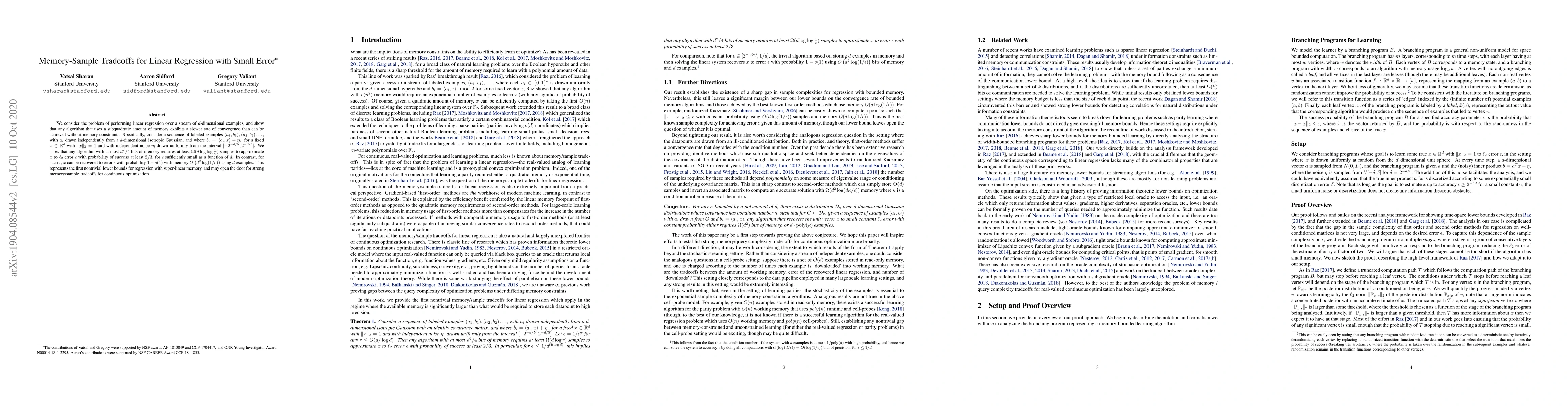 We consider the problem of performing linear regression over a stream of $d$-dimensional examples, and show that any algorithm that uses a subquadratic amount of memory exhibits a slower rate of convergence than can be achieved without memory constraints. Specifically, consider a sequence of labeled examples $(a_1,b_1), (a_2,b_2)\ldots,$ with $a_i$ drawn independently from a $d$-dimensional isotropic Gaussian, and where $b_i = \langle a_i, x\rangle + \eta_i,$ for a fixed $x \in \mathbb{R}^d$ with $\|x\|_2 = 1$ and with independent noise $\eta_i$ drawn uniformly from the interval $[-2^{-d/5},2^{-d/5}].$ We show that any algorithm with at most $d^2/4$ bits of memory requires at least $\Omega(d \log \log \frac{1}{\epsilon})$ samples to approximate $x$ to $\ell_2$ error $\epsilon$ with probability of success at least $2/3$, for $\epsilon$ sufficiently small as a function of $d$. In contrast, for such $\epsilon$, $x$ can be recovered to error $\epsilon$ with probability $1-o(1)$ with memory $O\left(d^2 \log(1/\epsilon)\right)$ using $d$ examples. This represents the first nontrivial lower bounds for regression with super-linear memory, and may open the door for strong memory/sample tradeoffs for continuous optimization.