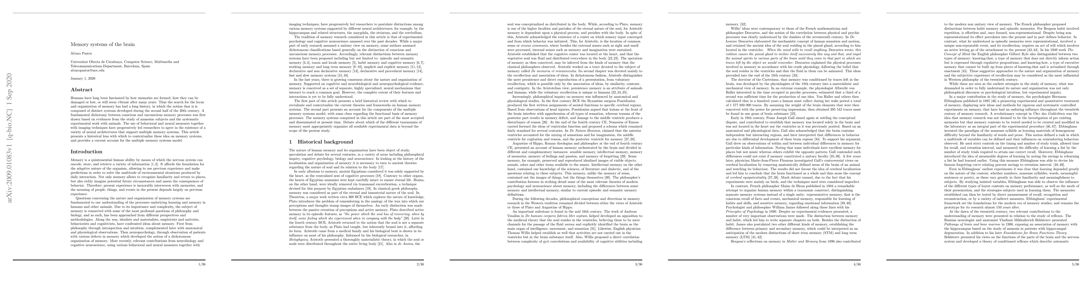 Humans have long been fascinated by how memories are formed, how they can be damaged or lost, or still seem vibrant after many years. Thus the search for the locus and organization of memory has had a long history, in which the notion that is is composed of distinct systems developed during the second half of the 20th century. A fundamental dichotomy between conscious and unconscious memory processes was first drawn based on evidences from the study of amnesiac subjects and the systematic experimental work with animals. The use of behavioral and neural measures together with imaging techniques have progressively led researchers to agree in the existence of a variety of neural architectures that support multiple memory systems. This article presents a historical lens with which to contextualize these idea on memory systems, and provides a current account for the multiple memory systems model.