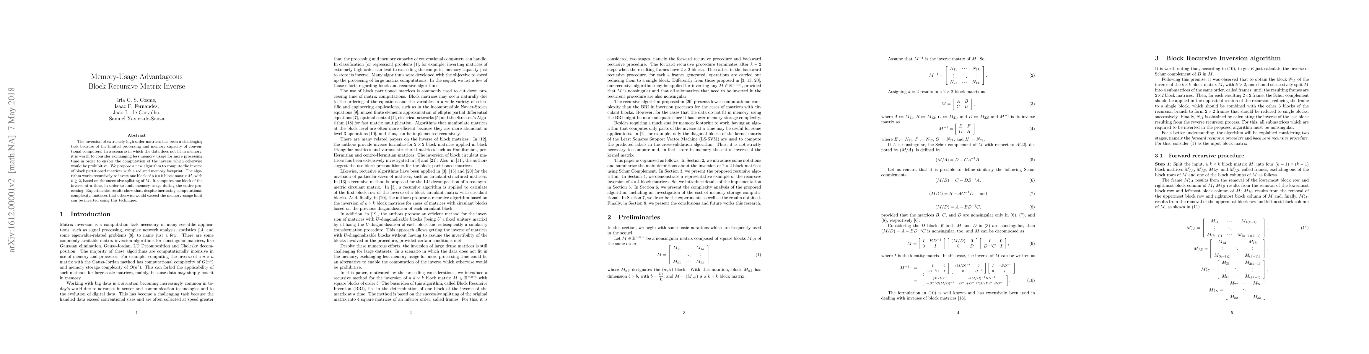 This paper proposes a recursive algorithm to compute the inverse of high-order block partitioned matrices with reduced memory usage, enabling the inversion of matrices that would otherwise exceed memory limits. Experimental results demonstrate that the method effectively balances increased processing time with lower memory consumption.