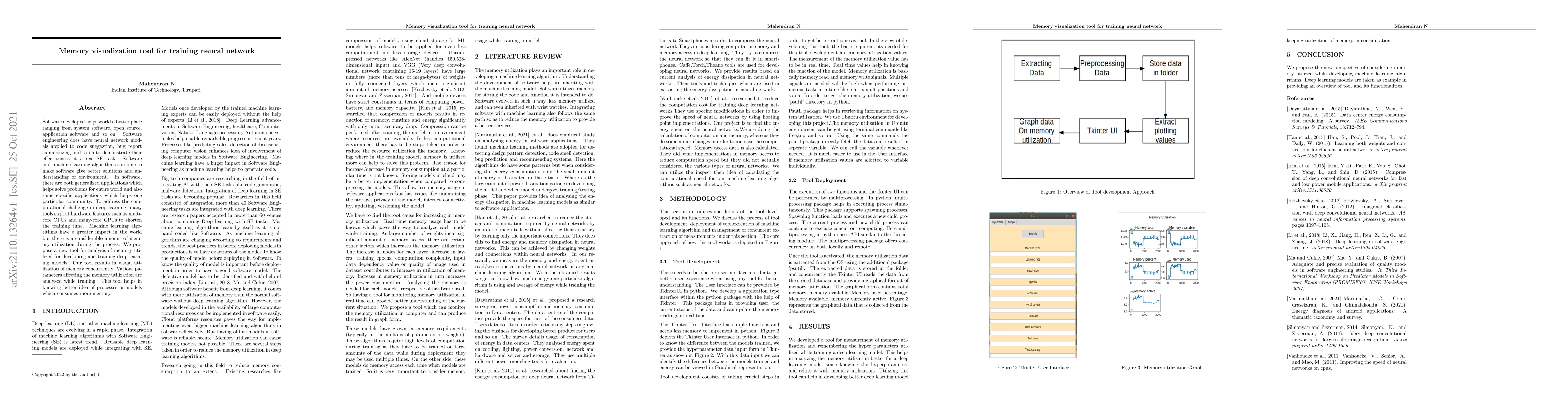 Software developed helps world a better place ranging from system software, open source, application software and so on. Software engineering does have neural network models applied to code suggestion, bug report summarizing and so on to demonstrate their effectiveness at a real SE task. Software and machine learning algorithms combine to make software give better solutions and understanding of environment. In software, there are both generalized applications which helps solve problems for entire world and also some specific applications which helps one particular community. To address the computational challenge in deep learning, many tools exploit hardware features such as multi-core CPUs and many-core GPUs to shorten the training time. Machine learning algorithms have a greater impact in the world but there is a considerable amount of memory utilization during the process. We propose a new tool for analysis of memory utilized for developing and training deep learning models. Our tool results in visual utilization of memory concurrently. Various parameters affecting the memory utilization are analysed while training. This tool helps in knowing better idea of processes or models which consumes more memory.