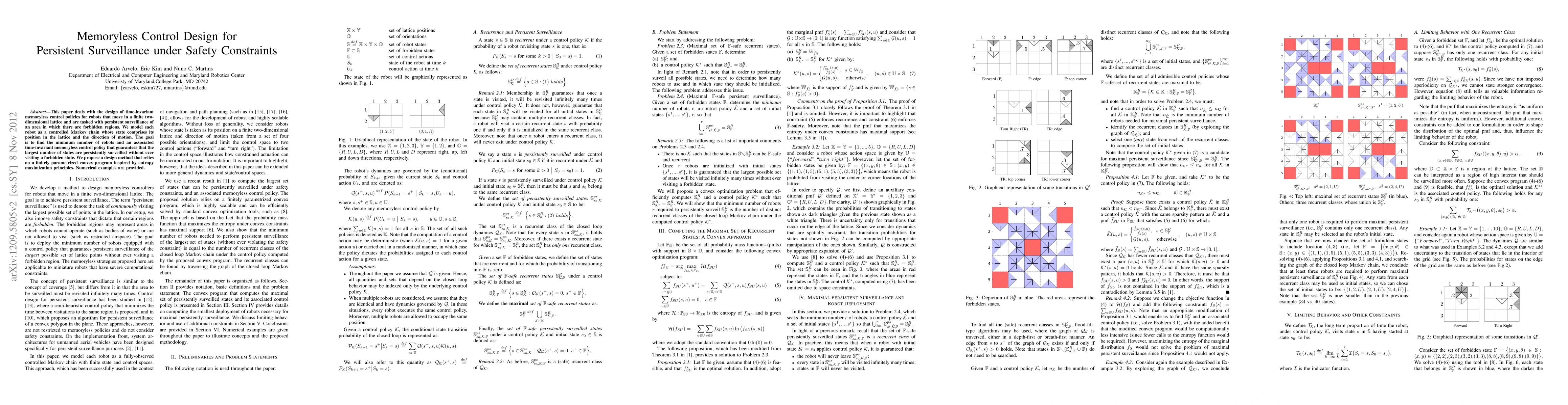 This paper deals with the design of time-invariant memoryless control policies for robots that move in a finite two- dimensional lattice and are tasked with persistent surveillance of an area in which there are forbidden regions. We model each robot as a controlled Markov chain whose state comprises its position in the lattice and the direction of motion. The goal is to find the minimum number of robots and an associated time-invariant memoryless control policy that guarantees that the largest number of states are persistently surveilled without ever visiting a forbidden state. We propose a design method that relies on a finitely parametrized convex program inspired by entropy maximization principles. Numerical examples are provided.