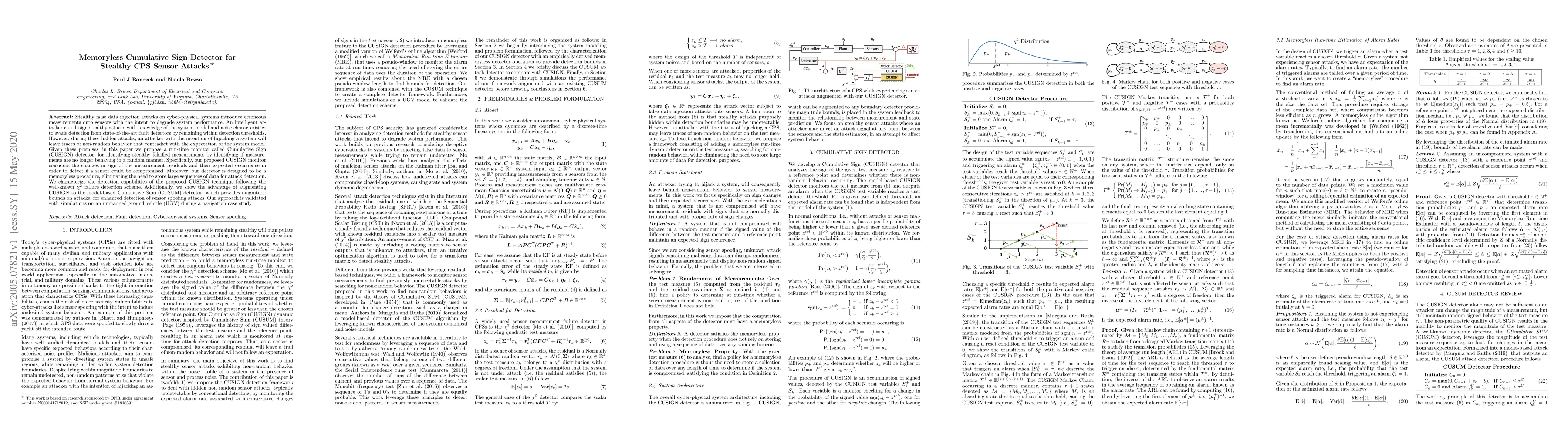 This paper proposes a memoryless Cumulative Sign (CUSIGN) detector to identify stealthy false data injection attacks in cyber-physical systems by monitoring non-random measurement behavior. The CUSIGN technique enhances detection by analyzing changes in the sign of measurement residuals without requiring large data storage, validated through simulations on an unmanned ground vehicle.