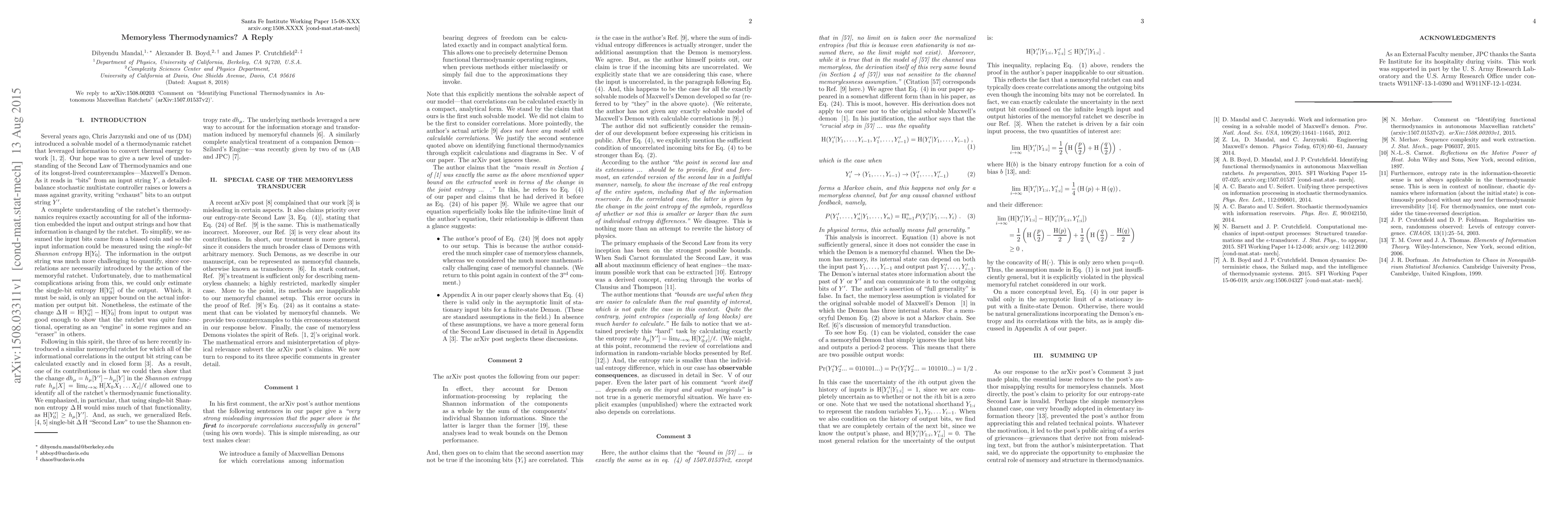 We reply to arXiv:1508.00203 `Comment on "Identifying Functional Thermodynamics in Autonomous Maxwellian Ratchets" (arXiv:1507.01537v2)'.