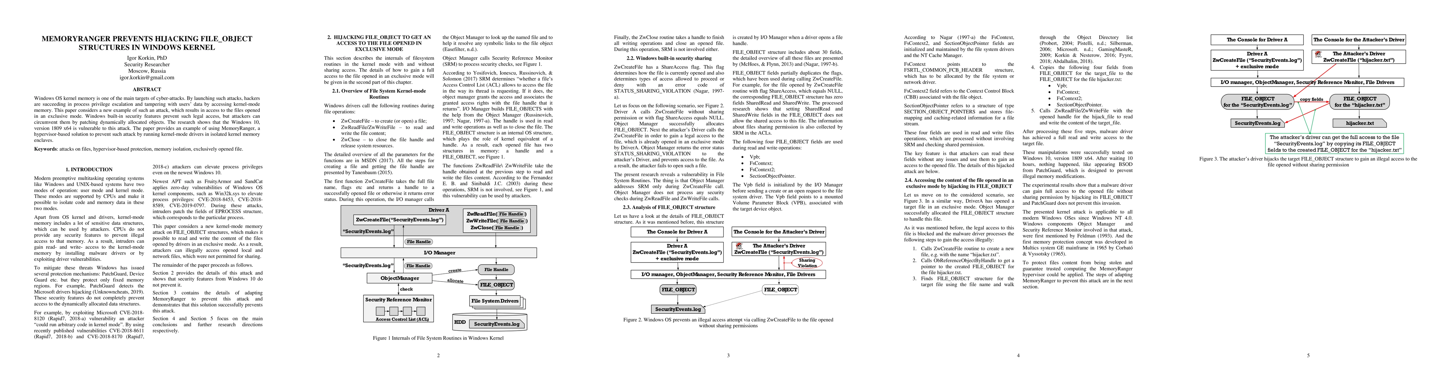 This paper investigates a cyber-attack targeting Windows kernel memory, allowing privilege escalation and unauthorized access to exclusive mode files. It introduces MemoryRanger, a hypervisor-based solution that isolates kernel-mode drivers in secure memory enclaves to prevent such attacks on Windows 10, version 1809 x64.