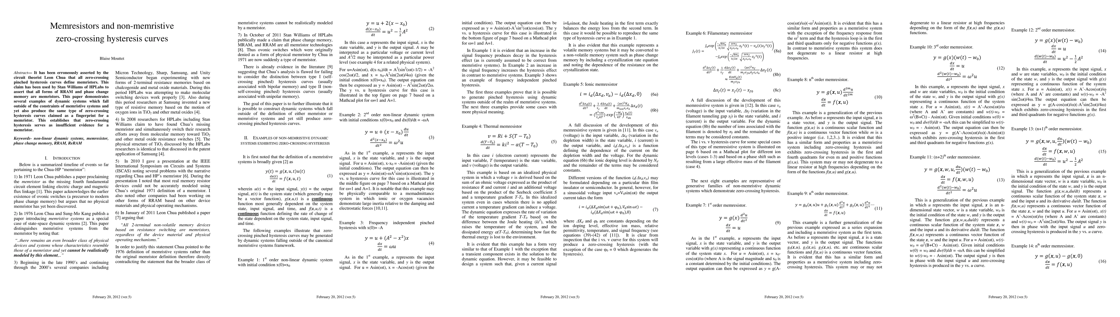 It has been erroneously asserted by the circuit theorist Leon Chua that all zero-crossing pinched hysteresis curves define memristors. This claim has been used by Stan Williams of HPLabs to assert that all forms of RRAM and phase change memory are memristors. This paper demonstrates several examples of dynamic systems which fall outside of the constraints of memristive systems and yet also produce the same type of zero-crossing hysteresis curves claimed as a fingerprint for a memristor. This establishes that zero-crossing hysteresis serves as insufficient evidence for a memristor. Keywords- nonlinear dynamic systems, memresistor, phase change memory, RRAM, ReRAM