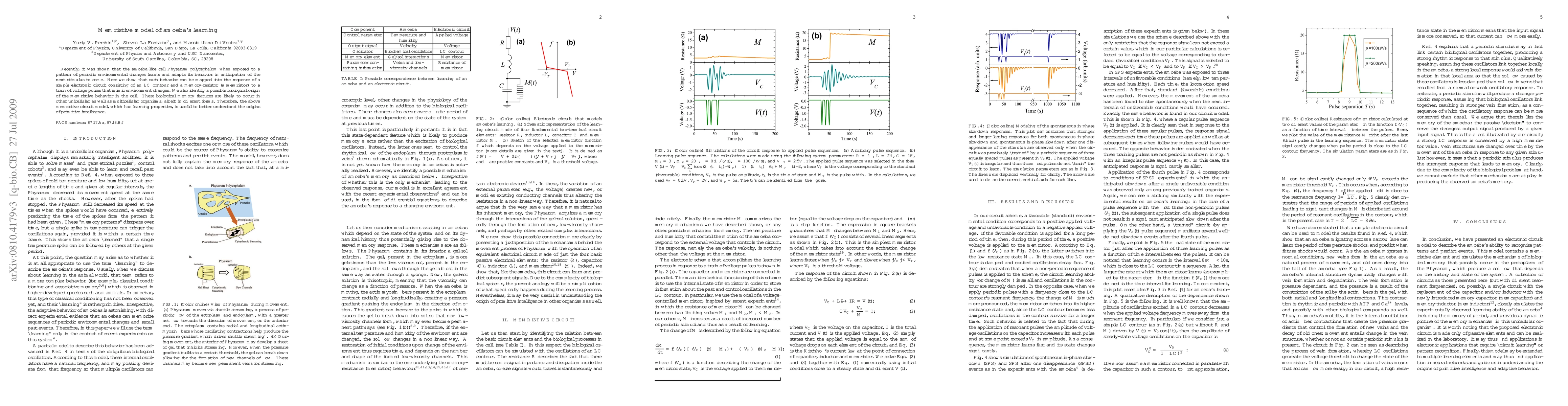Recently, it was shown that the amoeba-like cell {\it Physarum polycephalum} when exposed to a pattern of periodic environmental changes learns and adapts its behavior in anticipation of the next stimulus to come. Here we show that such behavior can be mapped into the response of a simple electronic circuit consisting of an $LC$ contour and a memory-resistor (a memristor) to a train of voltage pulses that mimic environment changes. We also identify a possible biological origin of the memristive behavior in the cell. These biological memory features are likely to occur in other unicellular as well as multicellular organisms, albeit in different forms. Therefore, the above memristive circuit model, which has learning properties, is useful to better understand the origins of primitive intelligence.