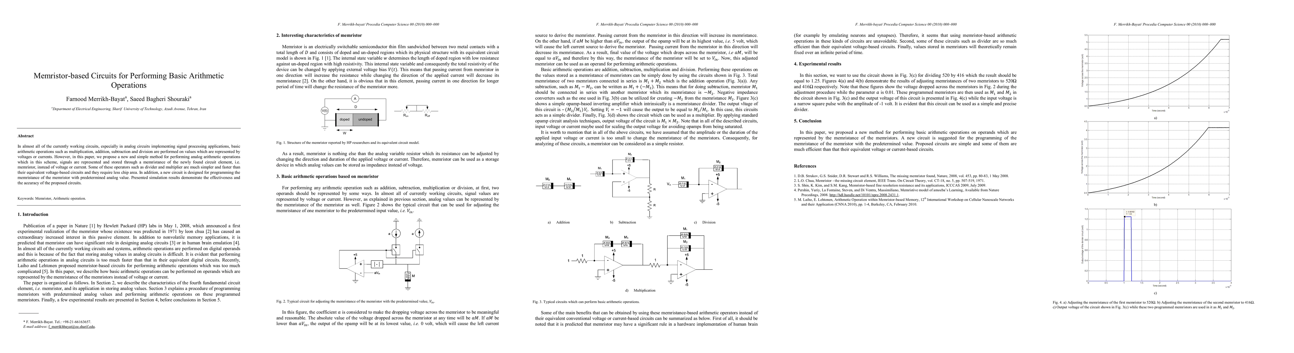 This paper proposes a novel method for performing basic arithmetic operations using memristors, which represent and store signals via memristance, offering simpler, faster, and more space-efficient alternatives to traditional voltage-based circuits. Simulation results confirm the effectiveness and accuracy of the proposed memristor-based arithmetic circuits.