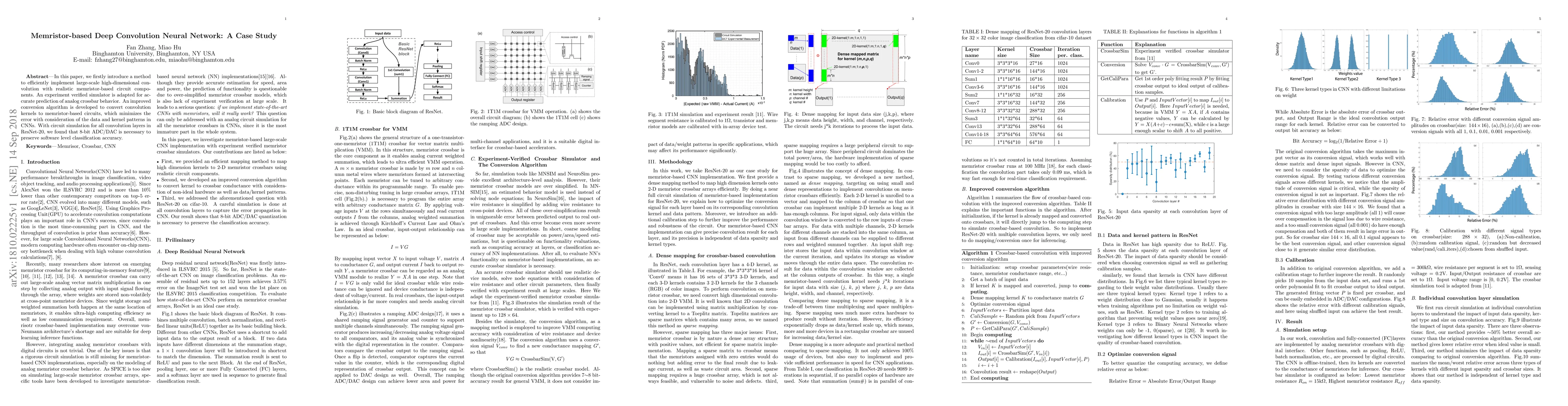 In this paper, we firstly introduce a method to efficiently implement large-scale high-dimensional convolution with realistic memristor-based circuit components. An experiment verified simulator is adapted for accurate prediction of analog crossbar behavior. An improved conversion algorithm is developed to convert convolution kernels to memristor-based circuits, which minimizes the error with consideration of the data and kernel patterns in CNNs. With circuit simulation for all convolution layers in ResNet-20, we found that 8-bit ADC/DAC is necessary to preserve software level classification accuracy.