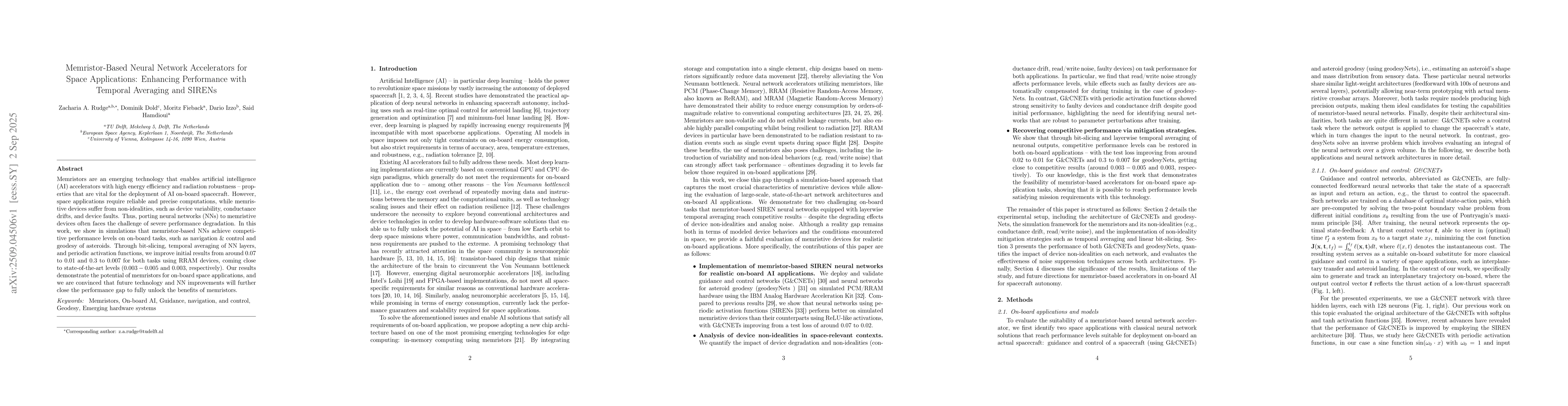 Memristors are an emerging technology that enables artificial intelligence (AI) accelerators with high energy efficiency and radiation robustness -- properties that are vital for the deployment of AI on-board spacecraft. However, space applications require reliable and precise computations, while memristive devices suffer from non-idealities, such as device variability, conductance drifts, and device faults. Thus, porting neural networks (NNs) to memristive devices often faces the challenge of severe performance degradation. In this work, we show in simulations that memristor-based NNs achieve competitive performance levels on on-board tasks, such as navigation \& control and geodesy of asteroids. Through bit-slicing, temporal averaging of NN layers, and periodic activation functions, we improve initial results from around $0.07$ to $0.01$ and $0.3$ to $0.007$ for both tasks using RRAM devices, coming close to state-of-the-art levels ($0.003-0.005$ and $0.003$, respectively). Our results demonstrate the potential of memristors for on-board space applications, and we are convinced that future technology and NN improvements will further close the performance gap to fully unlock the benefits of memristors.