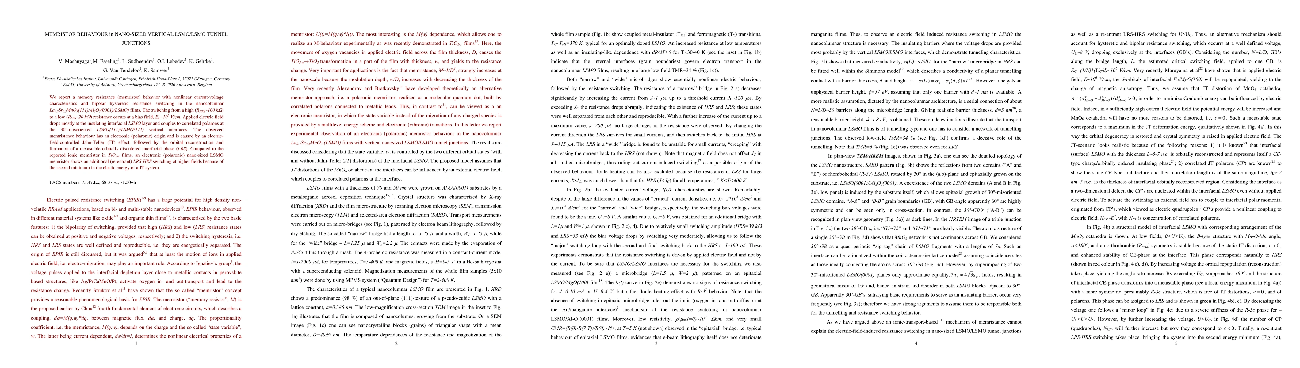 We report a memory resistance (memristor) behavior with nonlinear current-voltage characteristics and bipolar hysteretic resistance switching in the nanocolumnar manganite (LSMO) films. The switching from a high (HRS) to a low (LRS) resistance occurs at a bias field ~1 MV/cm. Applied electric field drops mostly at the insulating interfacial LSMO layer and couples to correlated polarons at the LSMO(111)/LSMO(111) vertical interfaces. The observed memristance behaviour has an electronic (polaronic) origin and is caused by an electric-field-controlled Jahn-Teller (JT) effect, followed by the orbital reconstruction and formation of a metastable orbitally disordered interfacial phase (LRS). Compared to the earlier reported ionic memristor in Ti-O films, an electronic (polaronic) nano-sized LSMO memristor shows an additional (re-entrant) LRS-HRS switching at higher fields because of the second minimum in the elastic energy of a JT system.