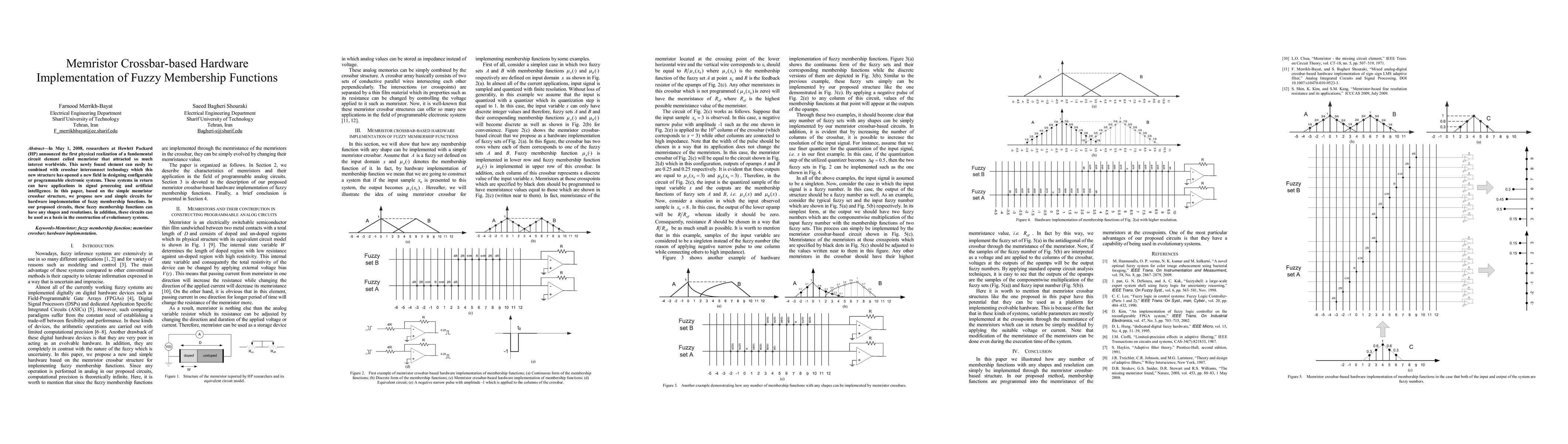 A memristor crossbar-based hardware implementation of fuzzy membership functions was proposed