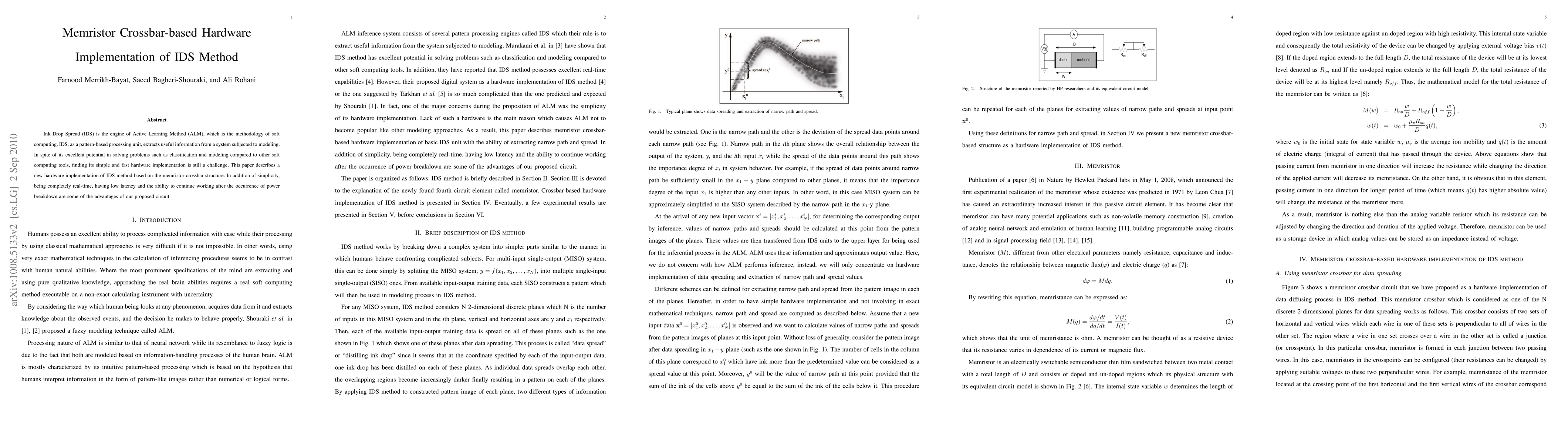 Ink Drop Spread (IDS) is the engine of Active Learning Method (ALM), which is the methodology of soft computing. IDS, as a pattern-based processing unit, extracts useful information from a system subjected to modeling. In spite of its excellent potential in solving problems such as classification and modeling compared to other soft computing tools, finding its simple and fast hardware implementation is still a challenge. This paper describes a new hardware implementation of IDS method based on the memristor crossbar structure. In addition of simplicity, being completely real-time, having low latency and the ability to continue working after the occurrence of power breakdown are some of the advantages of our proposed circuit.