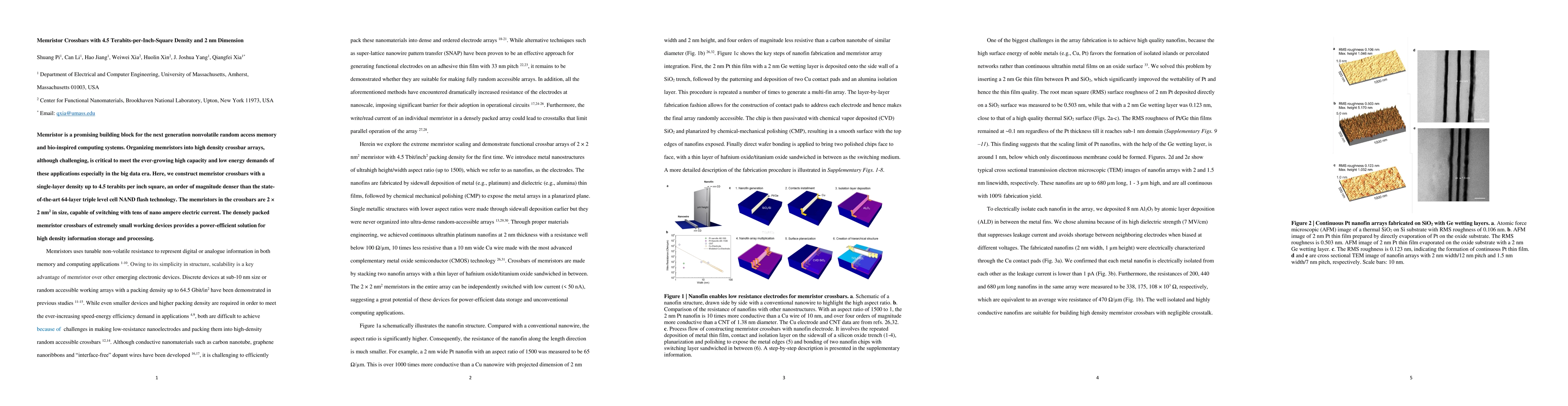This paper presents memristor crossbar arrays achieving a density of 4.5 terabits per square inch, significantly surpassing current NAND flash technology. The memristors are compact, measuring 2 × 2 nm², enabling power-efficient high-density information storage and processing.