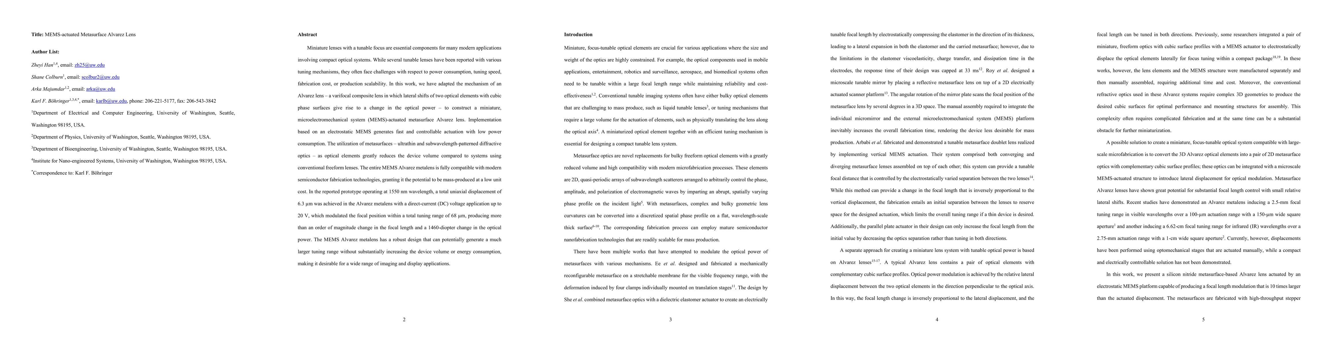 This paper presents a MEMS-actuated metasurface Alvarez lens that offers tunable focus with low power consumption and fast tuning speed. The metasurface design significantly reduces device volume and is compatible with semiconductor fabrication, enabling potential mass production at low cost.
