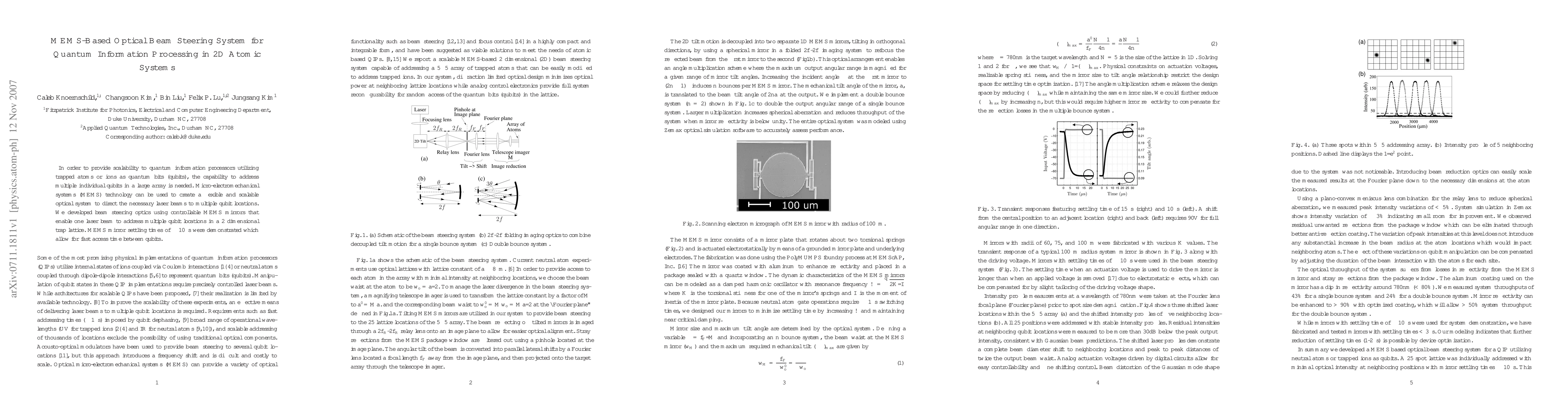 This paper presents a MEMS-based optical beam steering system for addressing multiple qubits in a 2D atomic system, utilizing MEMS mirrors to direct laser beams for quantum information processing. Demonstrated MEMS mirror settling times of 10 us enable fast qubit access, enhancing scalability in quantum information processors.
